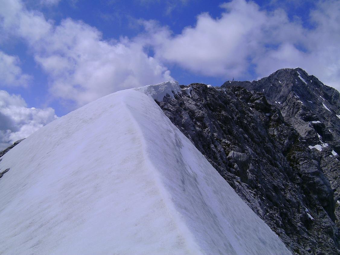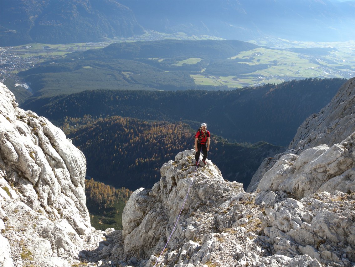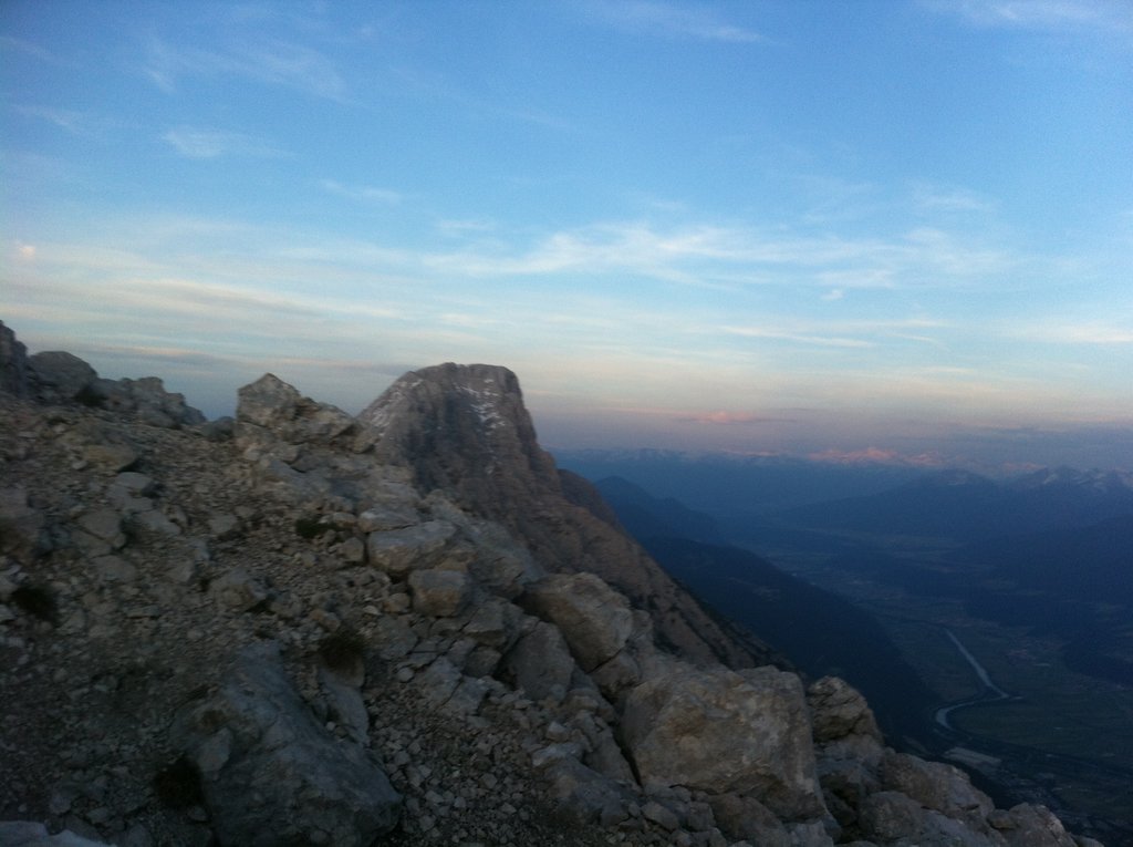 Alpine und sehr lange Sportklettertour durch die Südwand des Karkopfes. Die Route wurde begradigt und mit Bohrhaken gut abgesichert, was die Besucherzahl rapide ansteigen ließ. Die erste Seillänge vermittelt gleich Plaisir-Feeling pur - viele neue Bohrhaken in geringen Abständen und fester Fels, doch von diesem ersten Eindruck sollte man sich nicht blenden lassen. Um die 600 Höhenmeter (1075 Klettermeter) durch die Flanke zu überwinden, muß auch viel im Schrofengelände und teilweise brüchigen Fels geklettert werden - auch ist man dem Steinschlag der Voraussteigenden oft schutzlos ausgesetzt! Trotzdem eine lohnende Tour die trotz guter Absicherung einen recht alpinen Charakter hat.