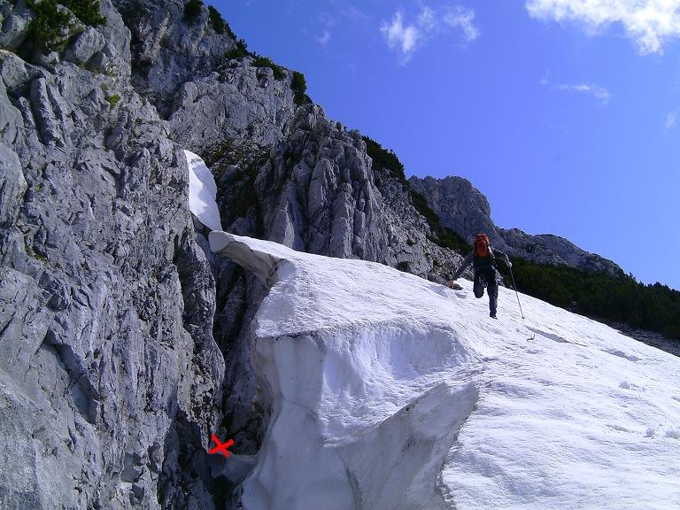 Vom Parkplatz folgt man dem Weg bis zum Strassberghaus, dort zweigt man rechts in Richtung Hohe Munde ab (oder 50 m vor dem Schranken am Parkplatz auf einem Forstweg, später Steig zum Weg Richtung Hohe Munde). Man folgt dem markierten Weg, anfangs durch Wald, später durch Latschenfelder bis zu einer beschilderten Abzweigung (1614 m) „Hintereggersteig“ zur Alplhütte. Dort links in Richtung Alplhütte, zuerst absteigend (an Rinnen vorbei), dem Steig folgend, bis man zu einer Art Wiese (mit Latschen) kommt. Weiter auf dem Steig, um eine Ecke bis zu einer Rinne (1558 m), welche unten stark ausgewaschen ist. Dort verlässt man den Weg und steigt in dieser Rinne höher – eine höhlenartige Steilstufe wird links umgangen – bis man direkt vor dem Einstieg (1756 m) steht.