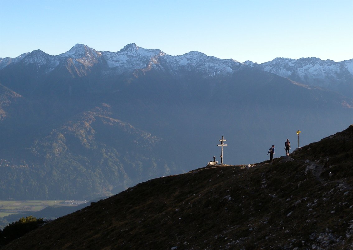 Vom Ausstieg links auf dem Grat weiter bis man auf einem Wiesenstück auf den markierten Normalweg trifft (von dort kurzer Abstecher auf den Gipfel möglich). Auf diesem hinunter zum Wetterkreuz, dann zur Alplhütte, von dieser zum Strassberghaus und weiter zum Parkplatz.