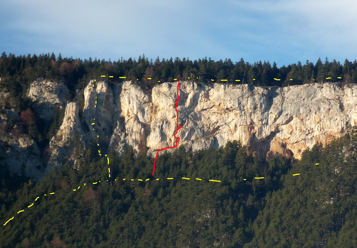 Achtung: Der künstsliche Tritt in der 2. Seillänge wurde angeblich entfernt, wodurch sich die Schwierigkeiten auf gut 8+ erhöhen dürften. Sollte aber A0 gehen.