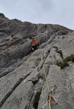 Eine Coole neu Tour an der Kopfkraxen, die einen leichten alpinen Charakter aufweist. Eine abwechslungsreiche und homogene Route mit überwiegender Wand- und Plattenkletterei. Es ist aber auch die ein oder andere Verschneidungen und Wasserrille vorhanden. So ähnlich wie die Clear Water. Es wird meist im festen und Wasserzerfressen Fels geklettert, aber auch für alle hater es gib vereinzelt schroffen und Grass Bänder in der Route. (;