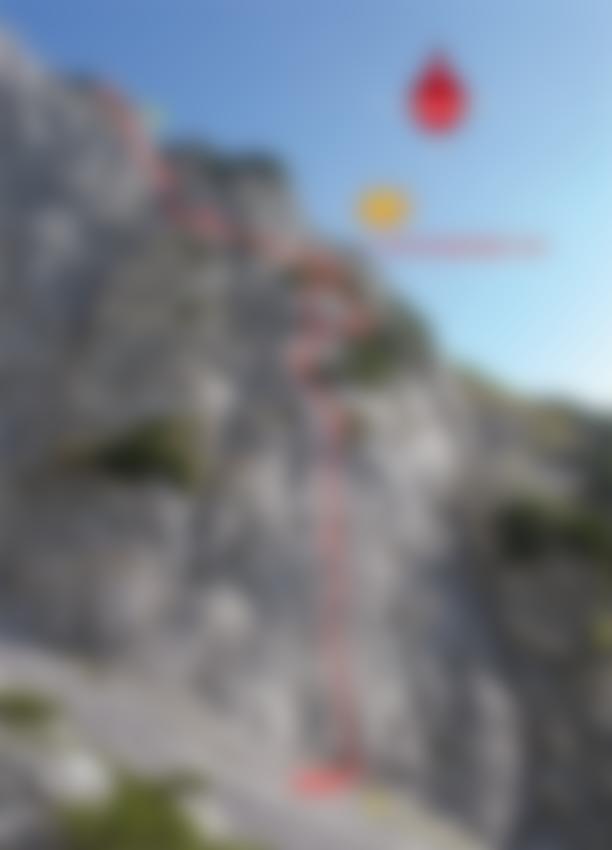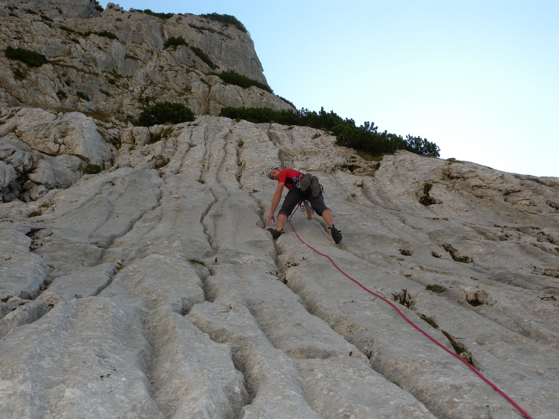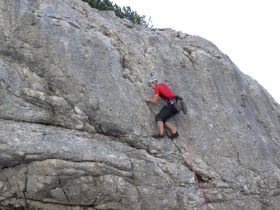 Siehe Topo. Unten leichte Platten, in der Mitte kurz 5/5+ über einen kleinen Überhang möglich. Oben an steile Passagen und einer Kaminrinne zum Ausstieg.