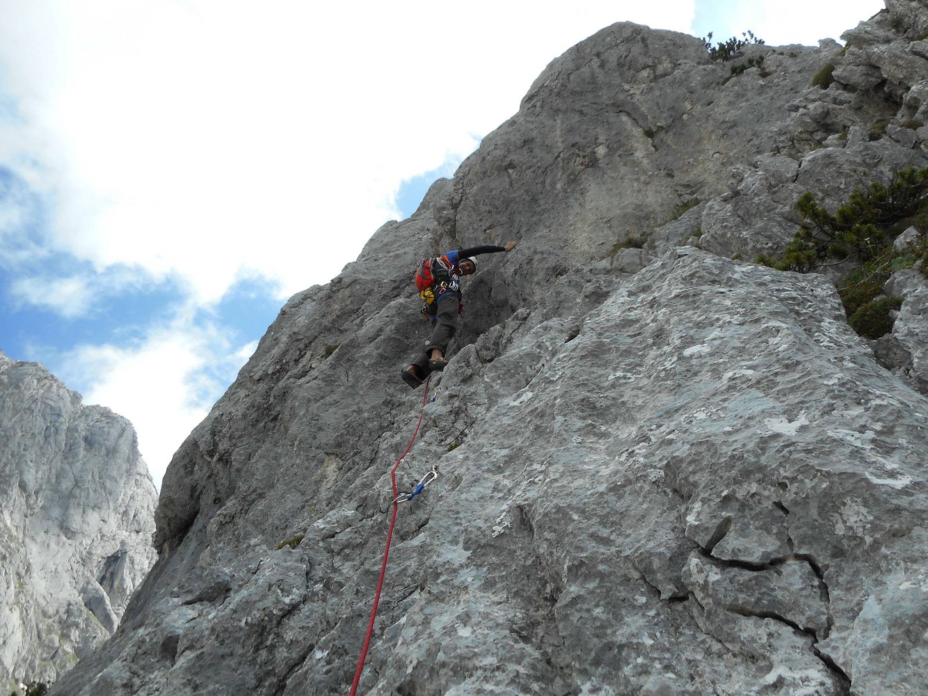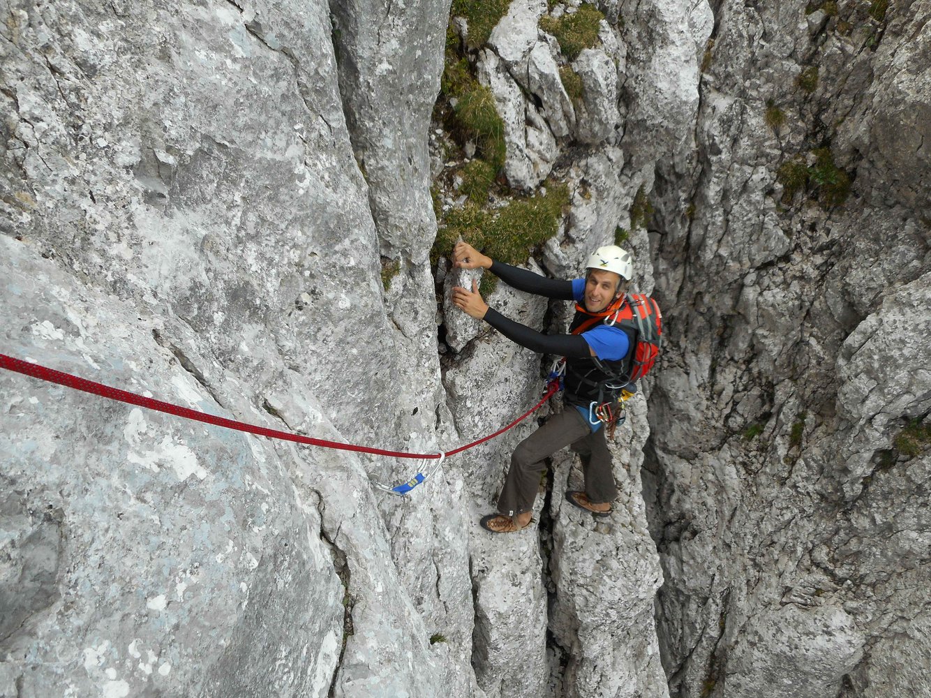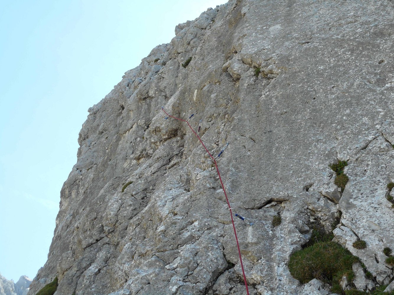 60 m Einfachseil, 11 Expresschlingen und Helm.