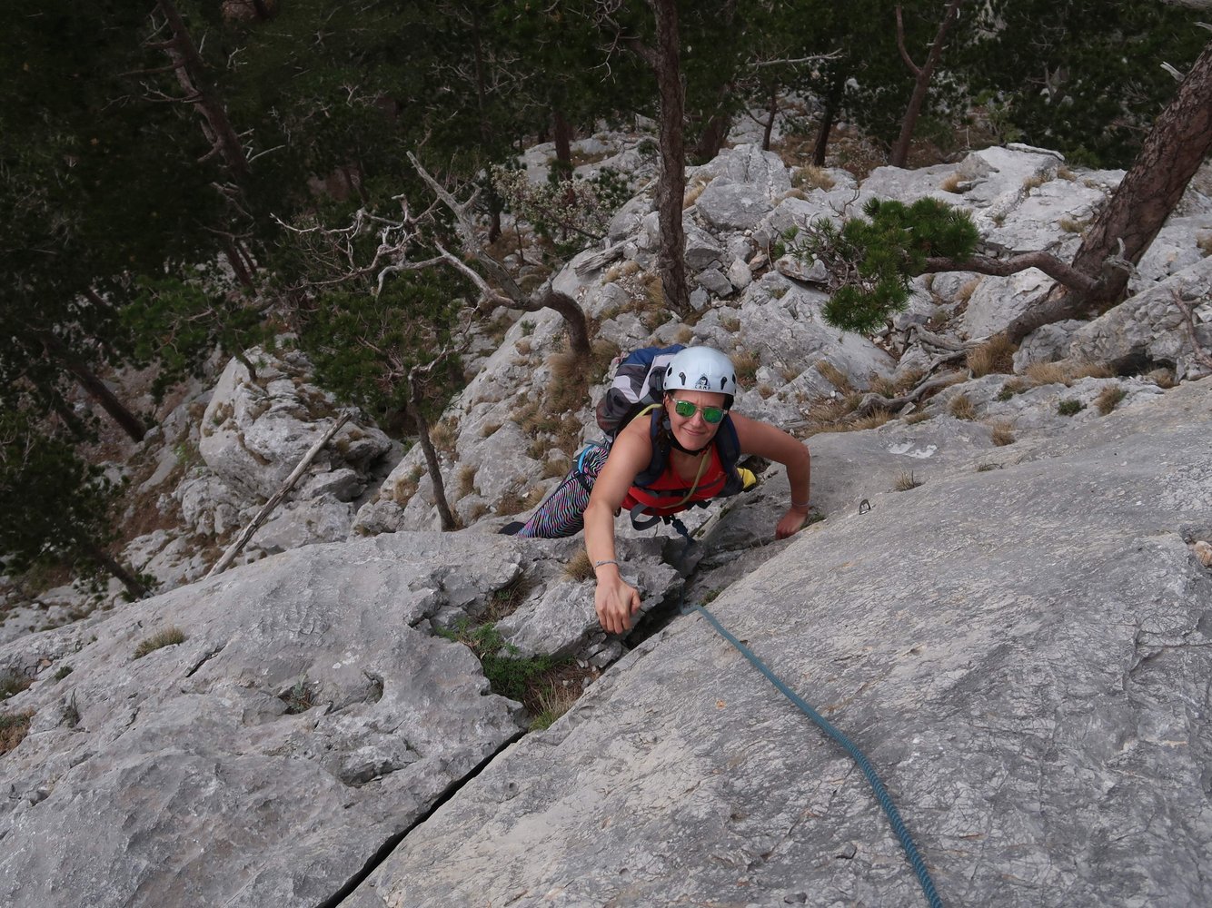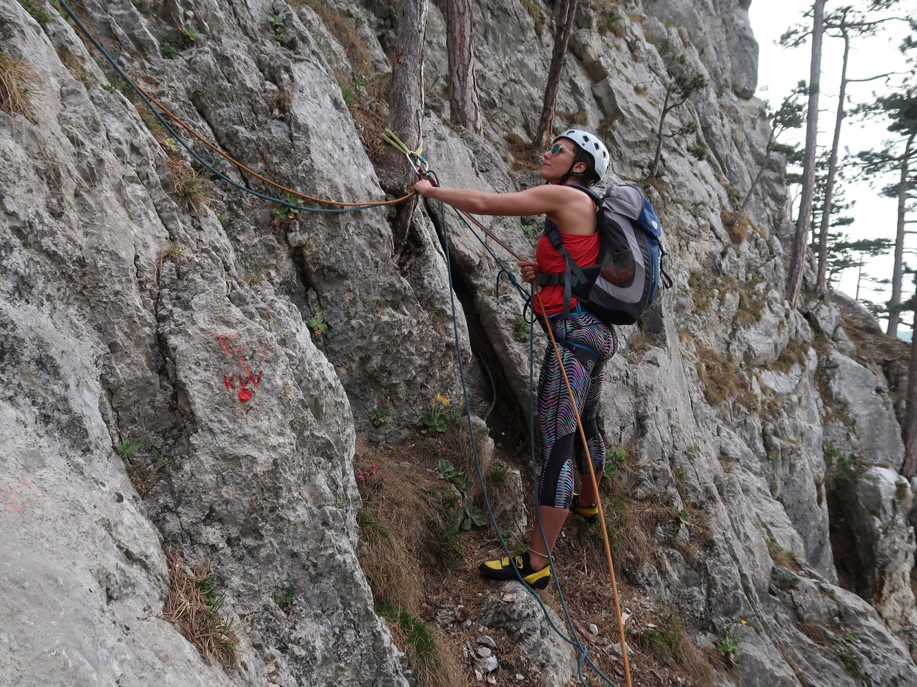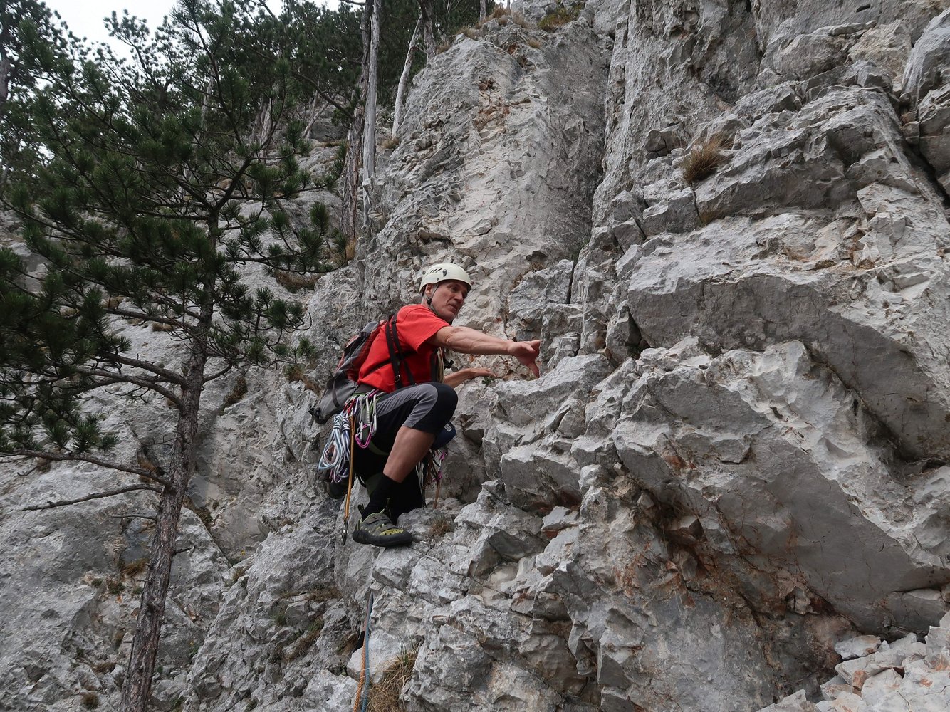 Tour wurde saniert und mit zusätzlichen Bolts ausgestattet, daher gut mit Bolts, Normalhaken und Sanduhrschlingen gesichert, dazwischen auch größere Hakenabstände, Stände an Bäumen.