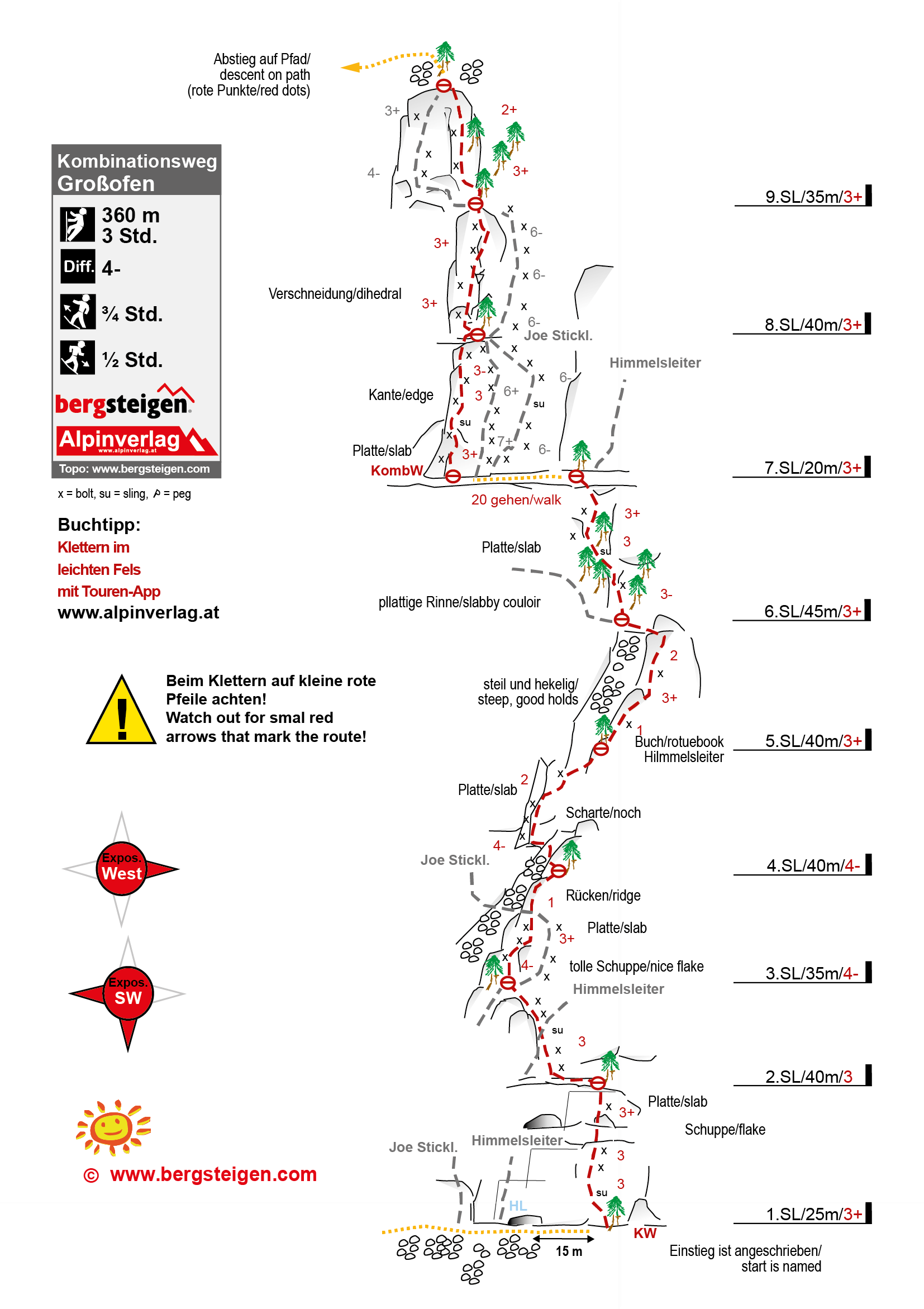 Lohnender Anstieg mit gesuchter Linie. Abwechslungsreicher und etwas alpiner Anstieg, der sich die schönsten Stellen in der stark gegliederten, mit Föhren bestandenen Wand sucht. Für diesen Schwierigkeitsgrad sehr lohnend. Der Fels ist rau und großteils von guter Qualität. Auf den Flachstellen liegen lose Steine, weshalb auf Steinschlag zu achten ist. Die Route ist mit Bohrhaken und Sanduhren gut gesichert, die Stände sind an dicken Bäumen. Die Routenführung kreuzt bzw. berührt den Joe-Stickler-Weg und den Sonnenplattenweg, deswegen sollte man genau auf das Topo achten.