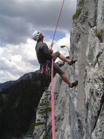Abseilen über die Route (siehe Topo!). Dann Schnellabstieg vom Großofen über die Geröllhalde unter der Himmelsleiter, welche direkt zur Schwarza führt. Einfach toll und schnell (10 min.)