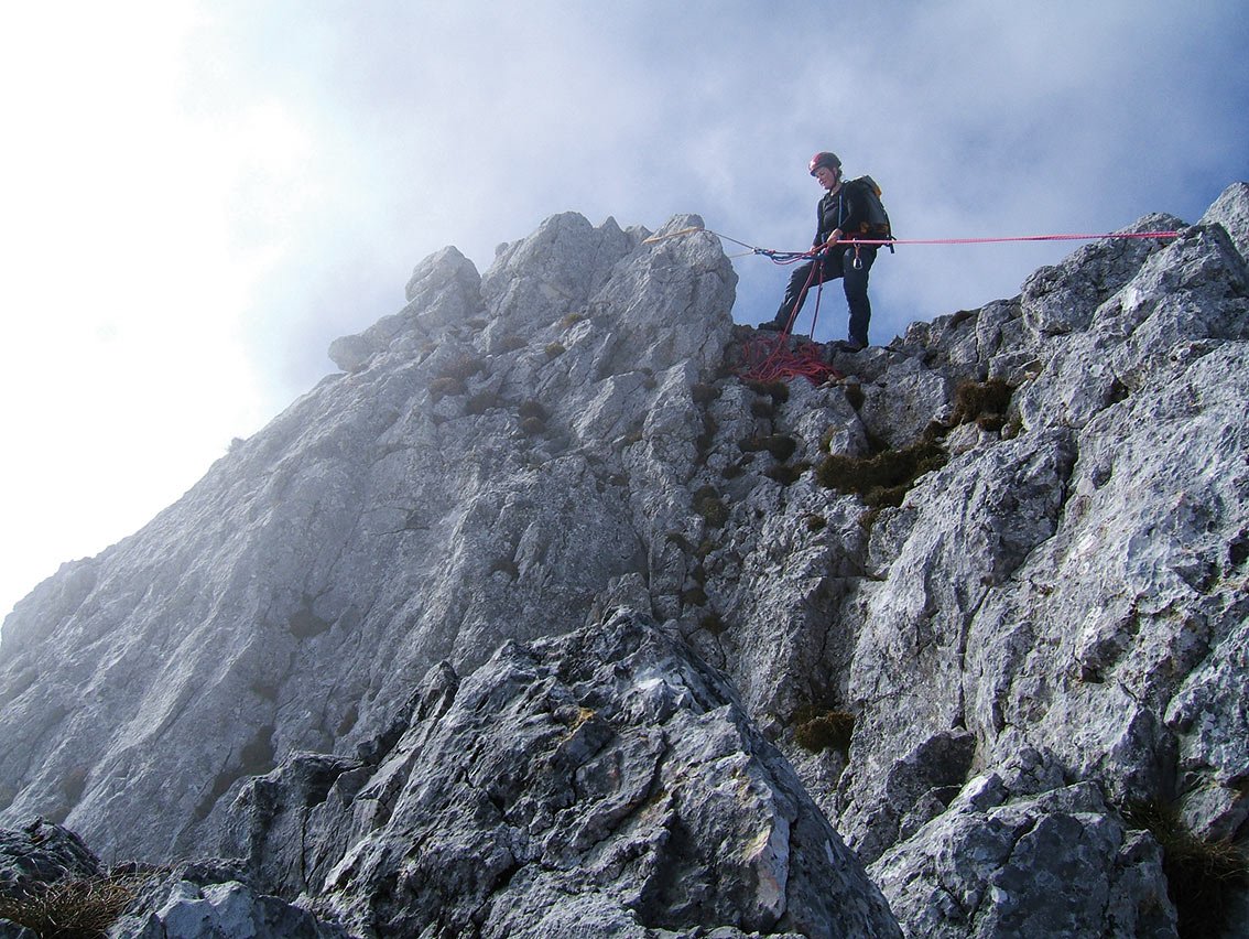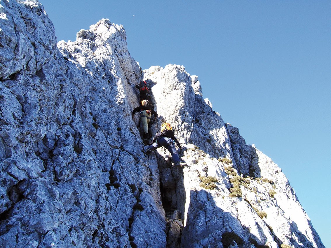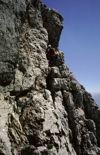 Achtung: Die angegebene Kletterzeit von 4,5 Stunden bezieht sich auf erfahren Seilschaften, die flott am laufenden Seil (oder in den leichten Passagen seilfrei) unterwegs sind! Alpinkletter-Einsteiger brauchen oft deutlich länger und werden nicht selten von der Bergrettung aus dieser Route geholt.