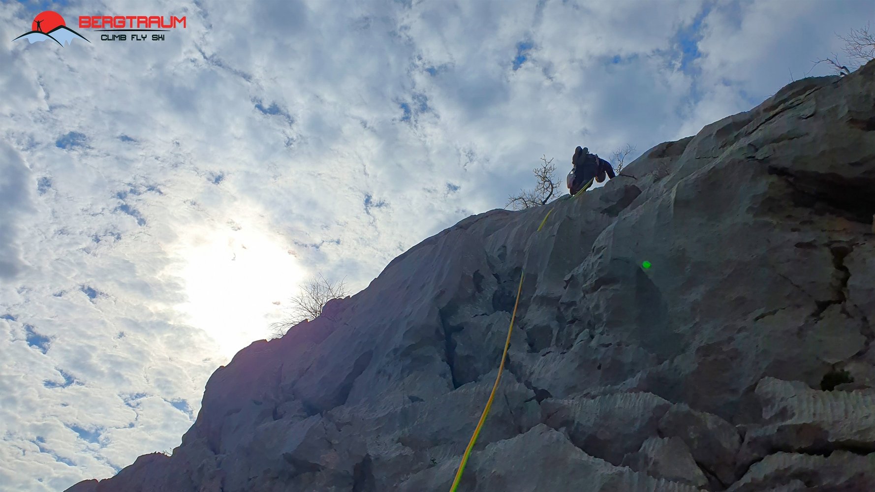 L7- 6a+: Markant nach rechts, dann schräg rechts hinauf, um eine Kante rum, dann wieder markant nach links und äußerst luftig senkrecht rauf zum Stand. Bis zum folgenden Abseiler im 2er Gelände für 40 Meter hinauf zum höchsten Punkt (Pfeil: „Abseil“).