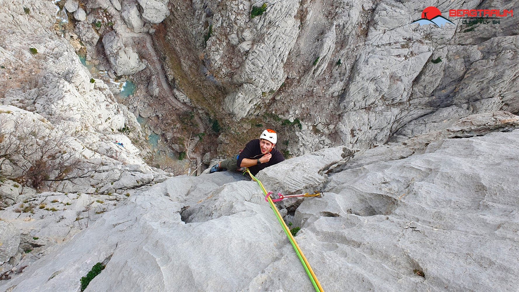 L6- 5c: Die typische 5c- Paklenica Länge: wenige bolts, plattig steil, dann ein Megariss und oben senkrecht raus zum Stand.