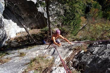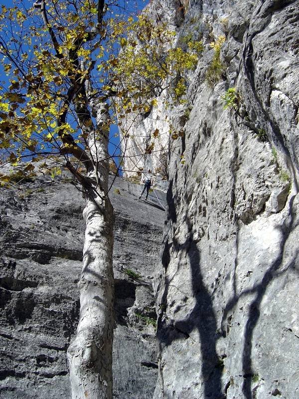 Die Route ist sehr gut mit Normalhaken abgesichert, wobei man zusätzlich noch sehr oft eine Sanduhr fädeln kann.