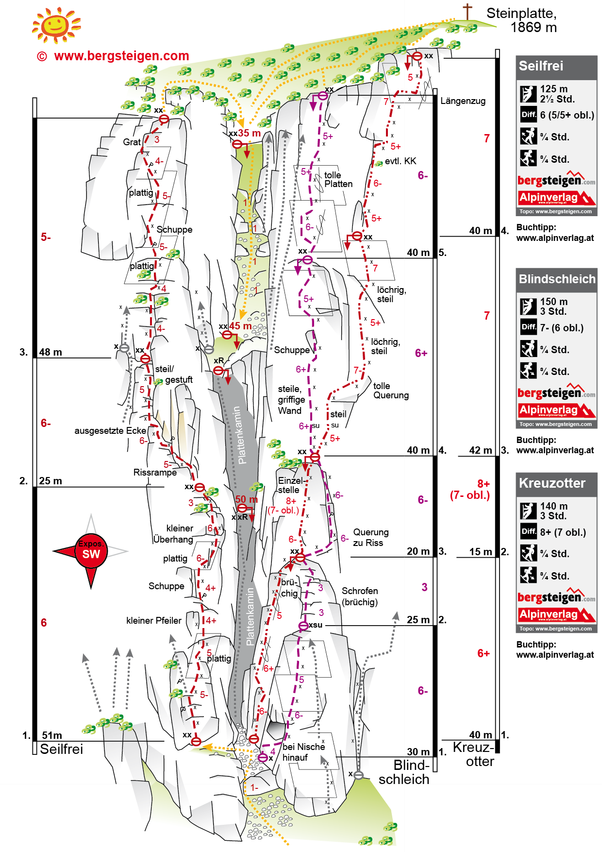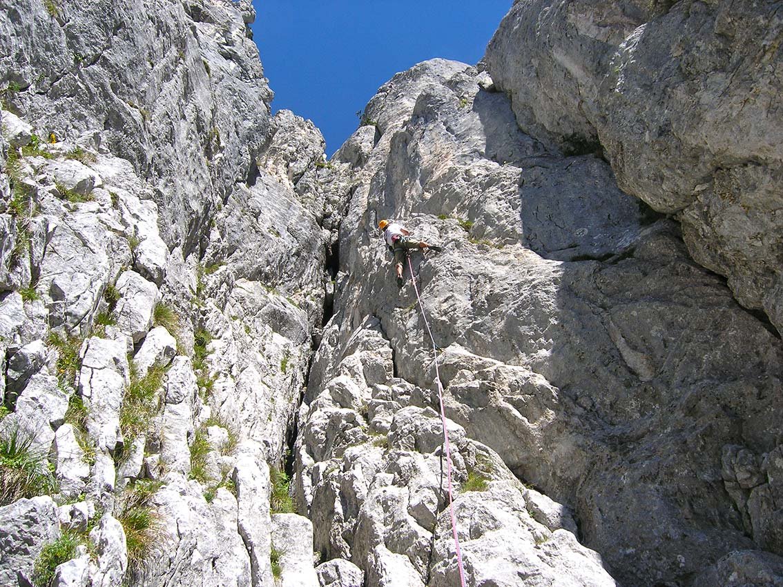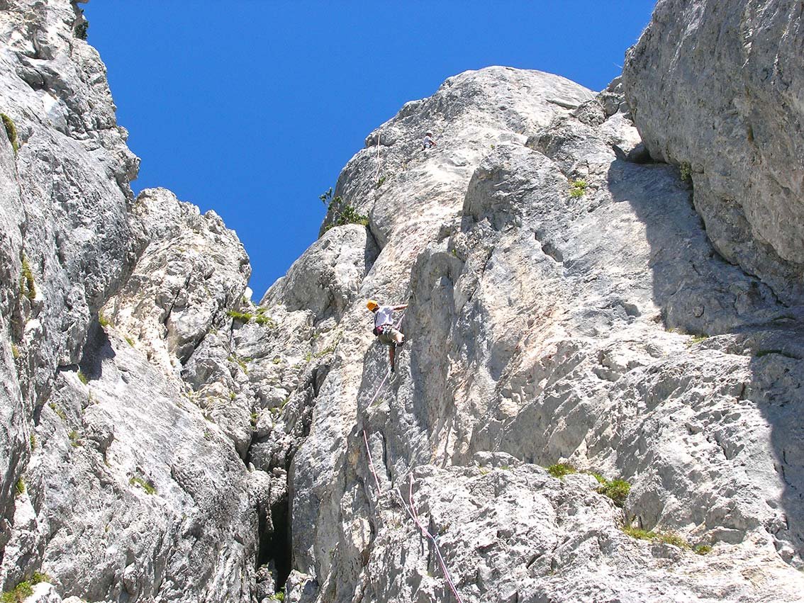 Entweder über die Touren abseilen oder vom Ausstieg nach links zur Grasrinne und zum sog. Plattenkamin (markante Rinne, die zu den Einstiegen hinunterführt). In den Rinnen abseilen - siehe Topo. Bei trockenen Verhältnissen kann man in der Grasrinne hinunterklettern - Stellen l und kommt zum 2. Abseilstand (siehe Topo). Dann im Plattenkamin 2 x mit Doppelseil zu den Einstiegen abseilen.