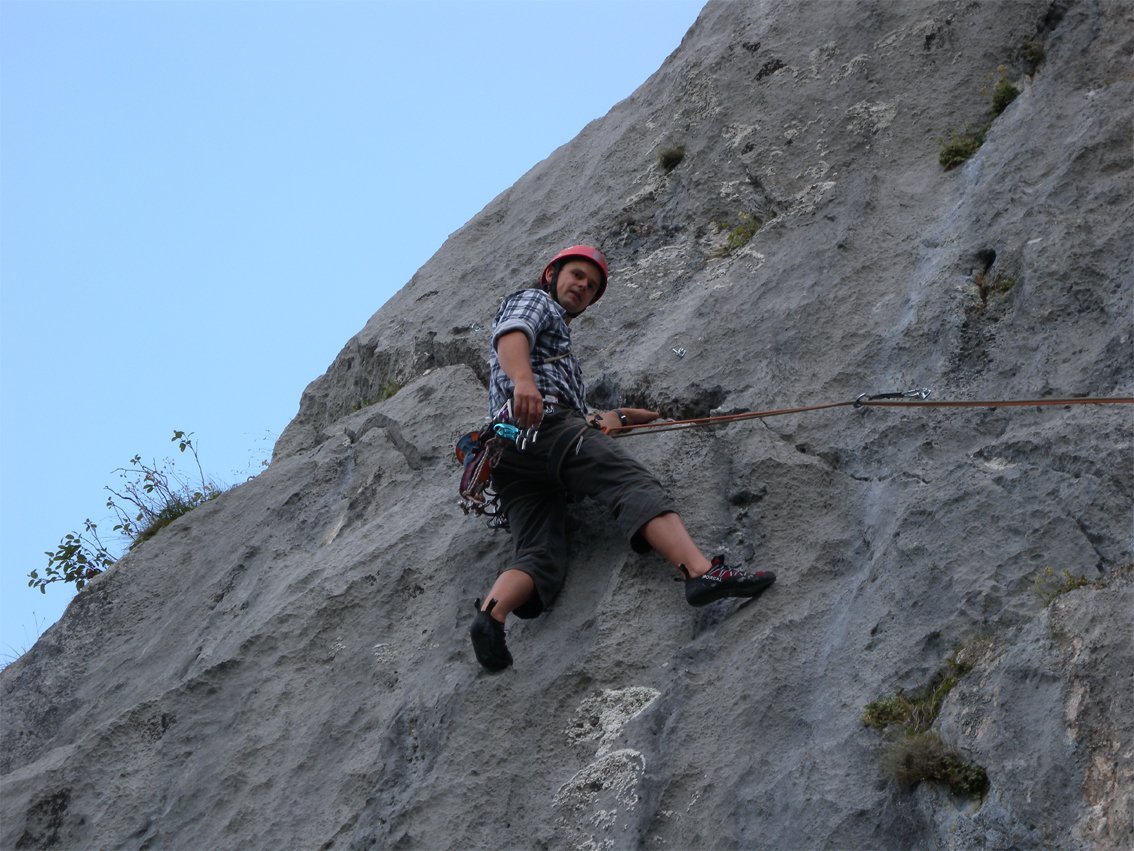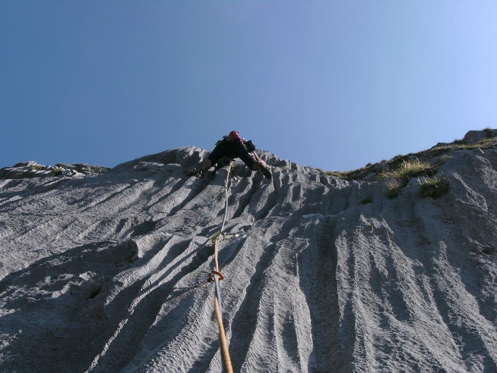 Gut mit Bohrhaken gesichert. Die Erstbegeher wollen angeblich die Plattenschlüsselstelle noch etwas nachsichern, auch der Weg zur Abseilpiste wird evtl. noch etwas markiert.