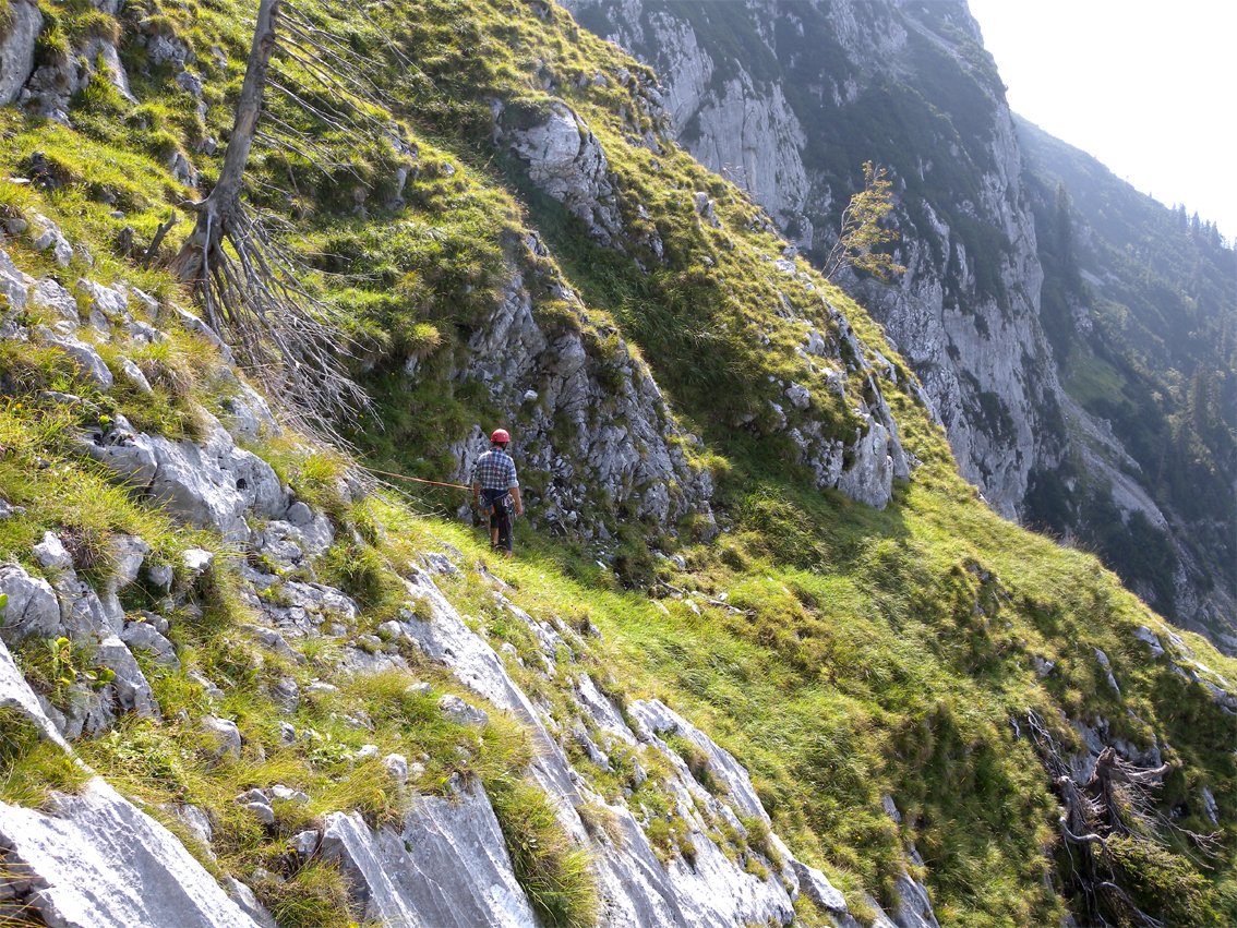 Vom Ausstieg nach rechts und - vorbei an einem morschen Baum - auf dem Grasband zu einem Flachstück absteigen (Flachstück vom Ausstieg nicht zu sehen). Dann eine steile Grasrampe hinauf zu einem weiteren Flachstück und zum Stand der Route RWI (Block mit Bolt und Sanduhrschlinge). Von dort sieht man schon links unten einen roten Punkt an der Flachstück-Kante (neue Abseilpiste mit roten Punkten markiert), man seilt am besten vom RWI-Stand dort hinunter ab.