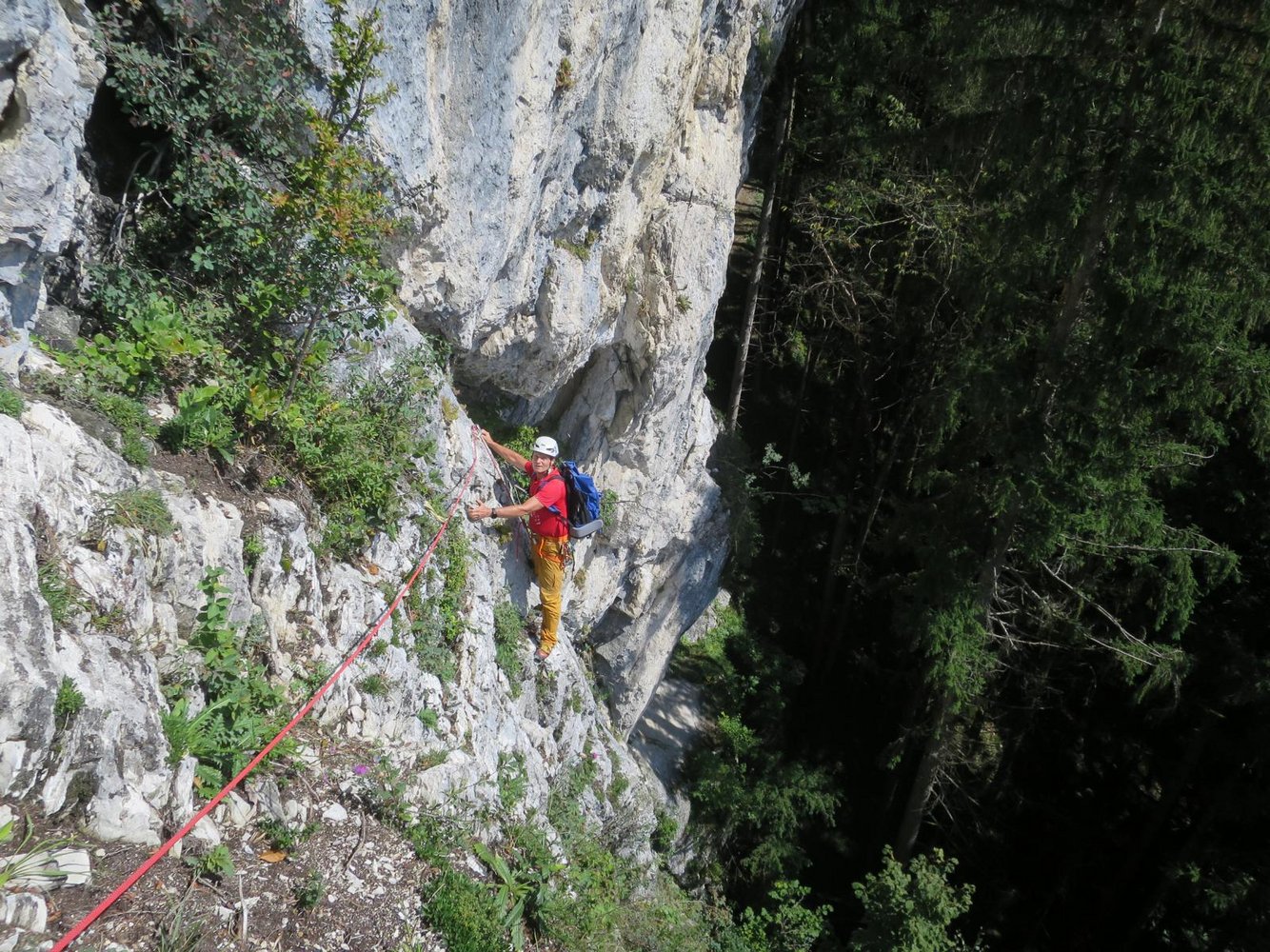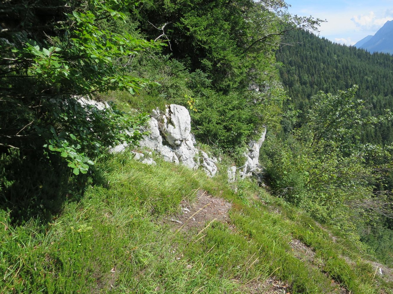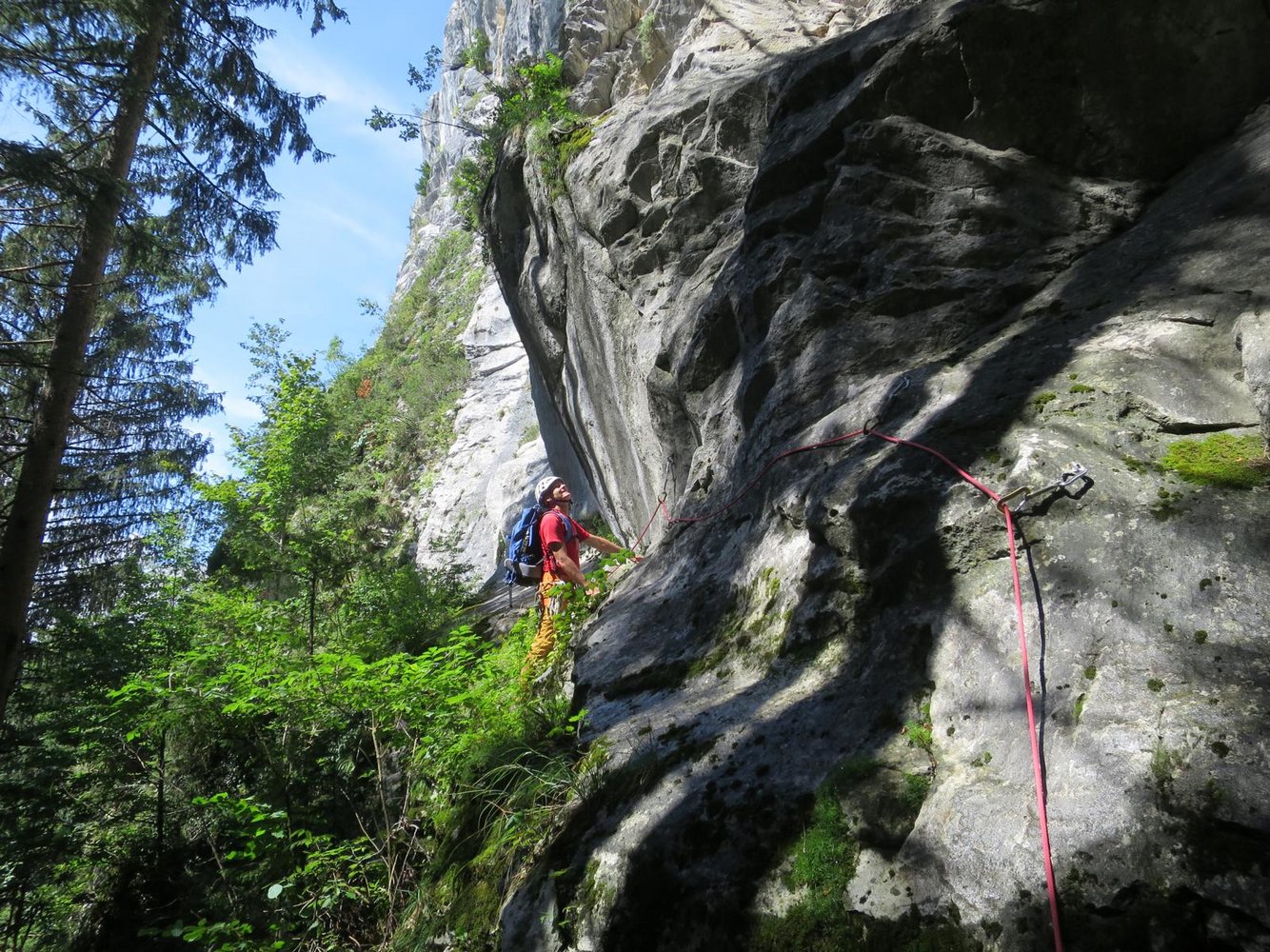 Zur Abseilpiste: Dem Höhenweg ca. 80 m bergauf Richtung Radsteig folgen bis dieser zum 2. mal nach rechts zur Wand führt, hier ist ein Absatz mit kleiner Wiese. Am linken Rand der Wiese führt ein Fixseil zur Abseilpiste. 2 x 30 m direkt zum Einstieg.