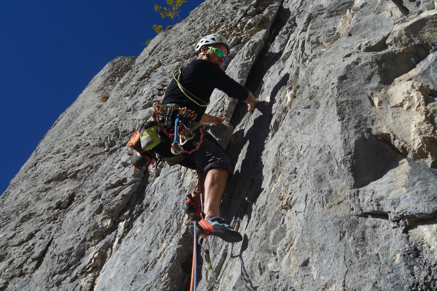 1. SL: Den herrlichen Piazriss gerade hinauf (6+, 6), kurz etwas leichter (5) und rechts zu einer Platte. Über diese (6/6+) zum Stand auf dem Absatz unter gelber Wand. (35 m, 6+, 10 BH)