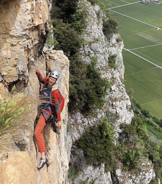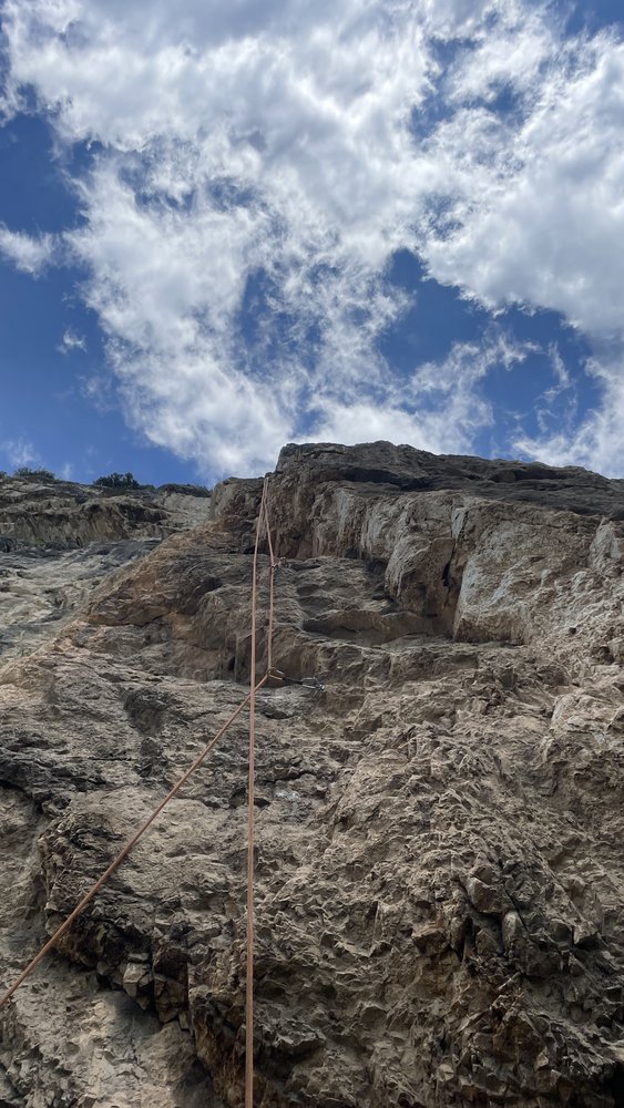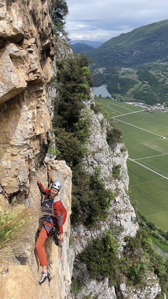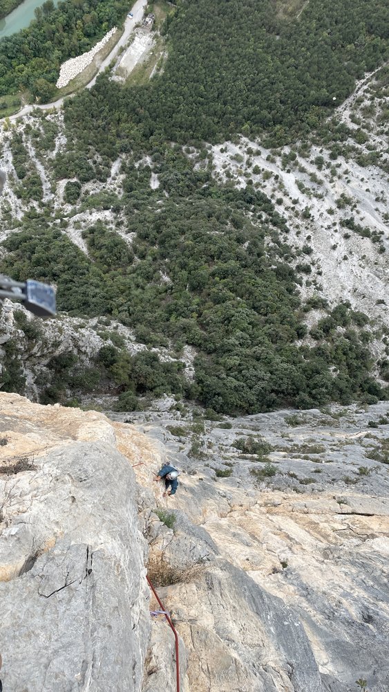 Über die Route mit zwei 60m Seilen abseilen oder den im Kletterführer oder mit GPS Track auf Bergsteigen.com bei der Route "non solo pane"beschriebenen Abstieg zu Fuß nehmen.
