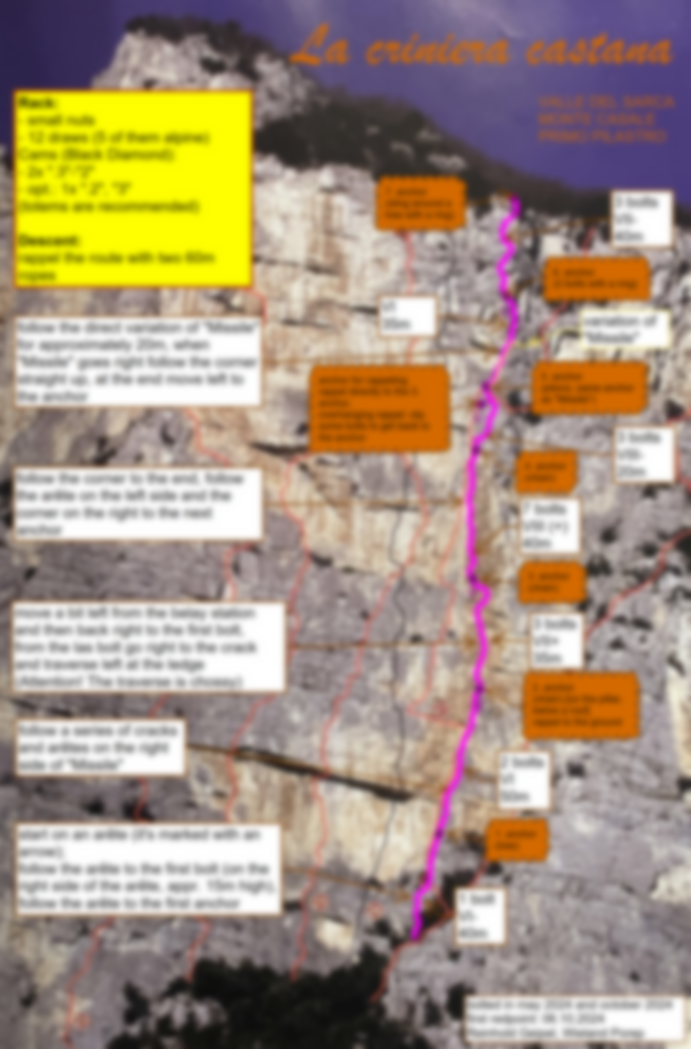 Bohrhaken wurden an den Stellen gesetzt an denen keine Cams oder Keile liegen. Auf Schlaghaken wurde auf Grund der Haltbarkeit selbiger verzichtet. Das Resultat ist eine direkte Linie mit teilweise luftiger Kletterei.
