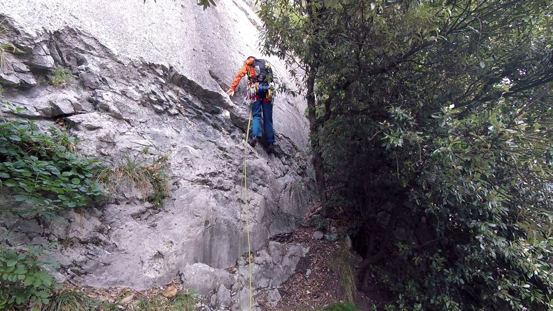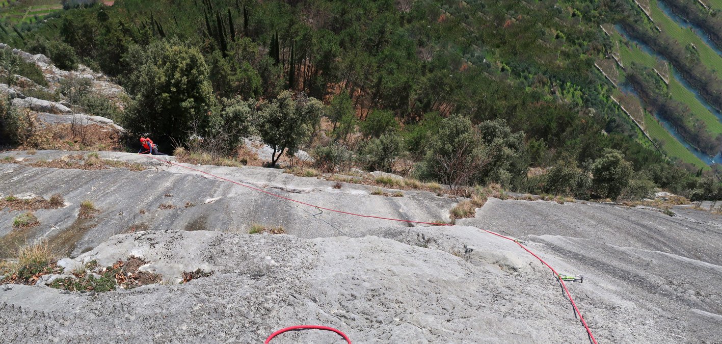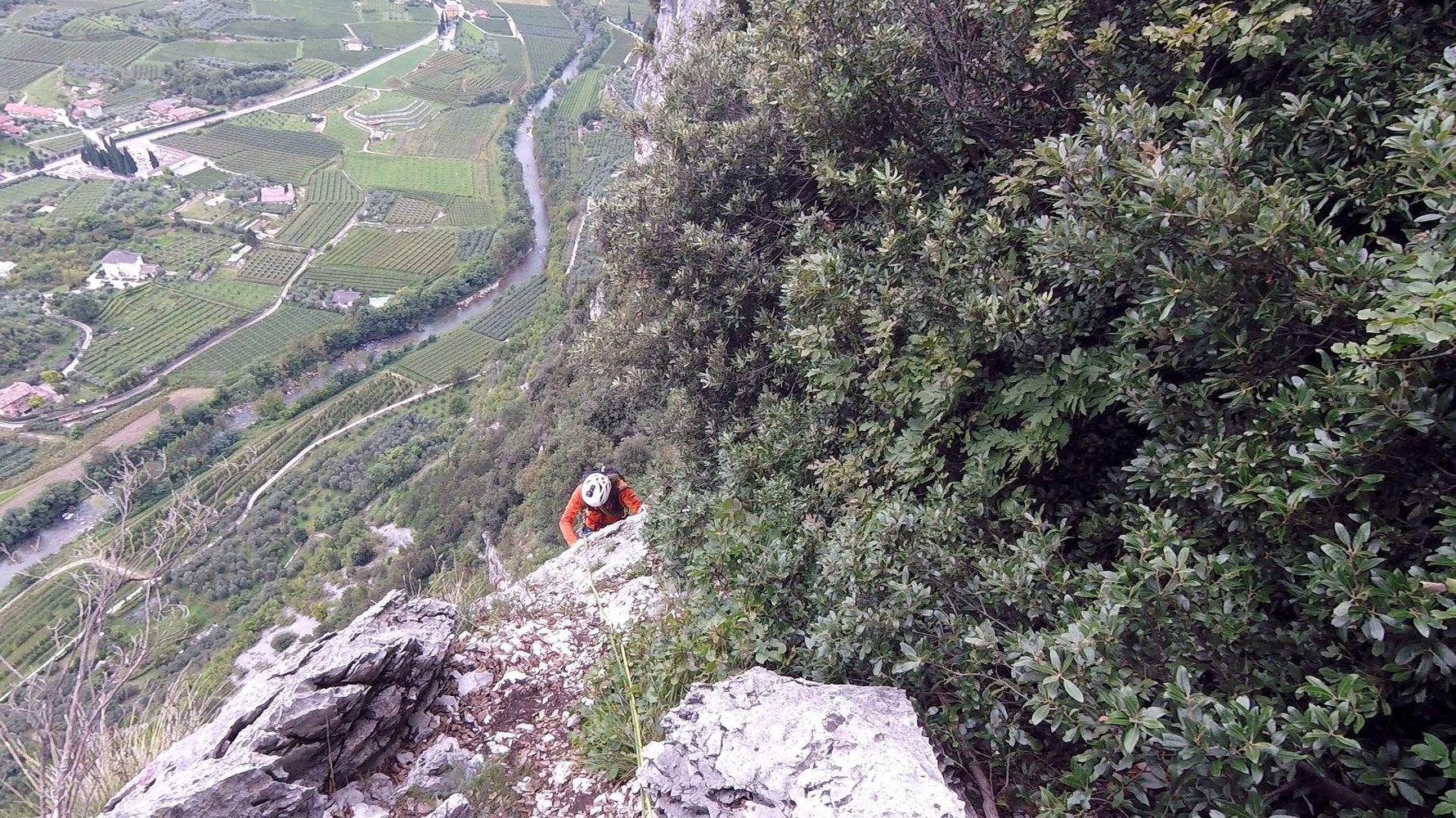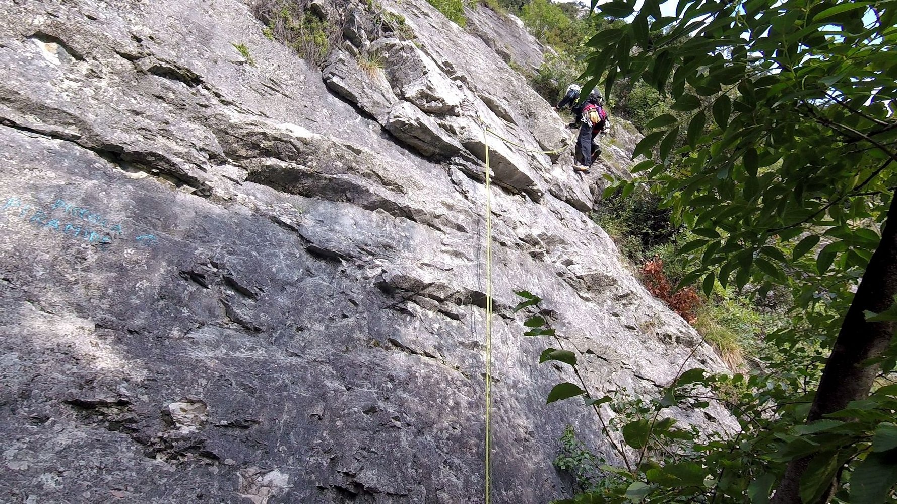 Vom Ausstieg folgt man dem Pfad (Steinmännchen) nach rechts bis man auf den Wanderweg "Percorso delle Cavre" trifft. Oben auf dem Weg dann nach rechts bis zum kleinen Klettersteig „Sentiero dell’ Anglone“ und auf diesem wieder hinunter zum Sportplatz.