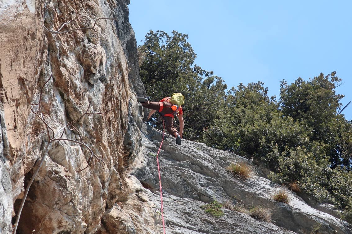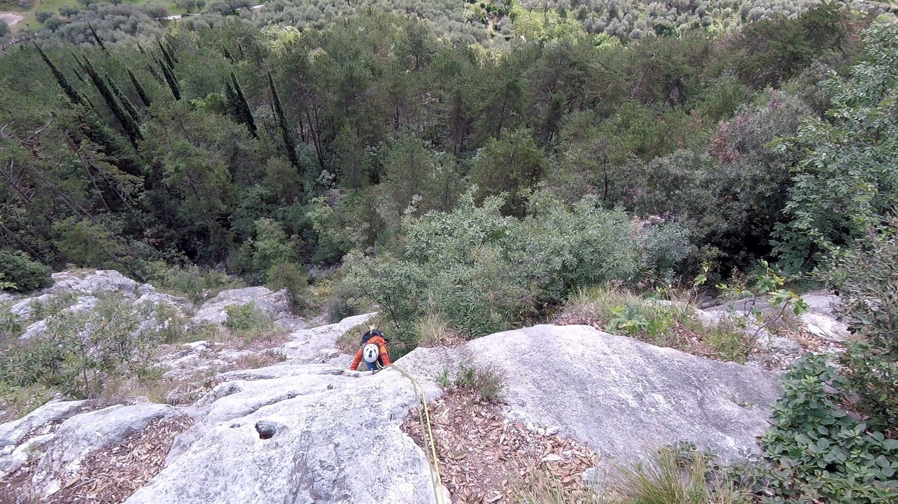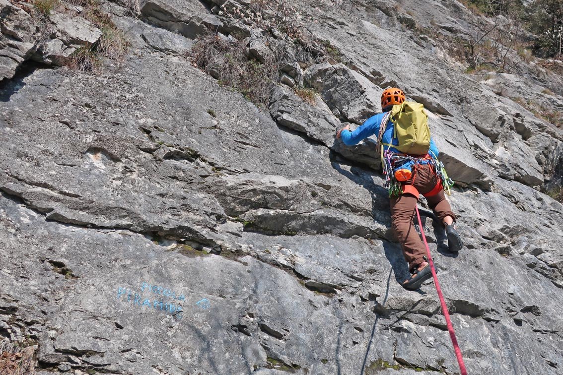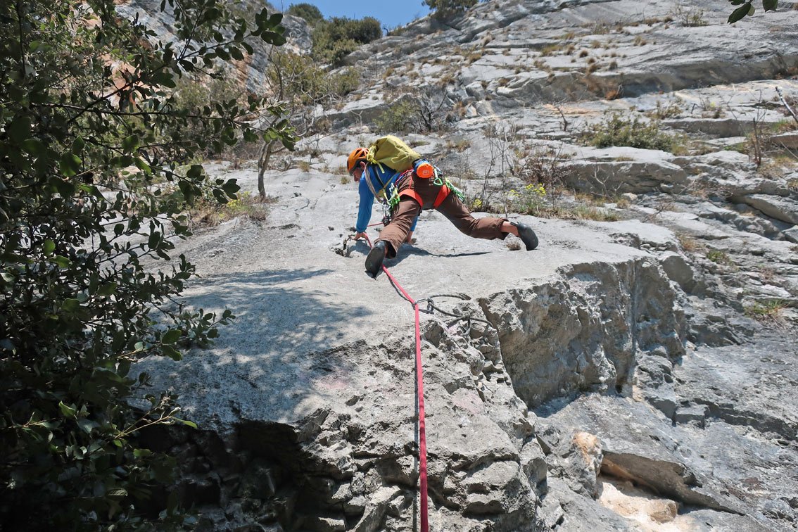 Die Route La piccola piramide ist ähnlich wie die Scalette dell' Indria ein Klassiker an der Coste dell' Anglone - und das zu recht! Die Kletterei ist sehr abwechslungsreich - unten Platten, dann raue schöne, steilere Wandpassagen und ab der Mitte schöne Verschneidungen. Das Highlight ist der finale waagrechte Quergang zur vorderen letzten Seillänge, bei der man sich mit reichlich Luft unterm Hintern die Finger lang ziehen muss. Angenehm ist der "gestufte" Charakter der Route - oft gibt es kleine Bänder und Absätze, die das ganze (mit Ausnahme der beiden Seillängen am Ende) nicht ganz so spektakulär erscheinen lassen. Gesamt eine lohnende Grill&Klucknerroute, die man auch in Erwägung ziehen kann, wenn bei der "Scalette dell' Indria" der Andrang zu groß ist.