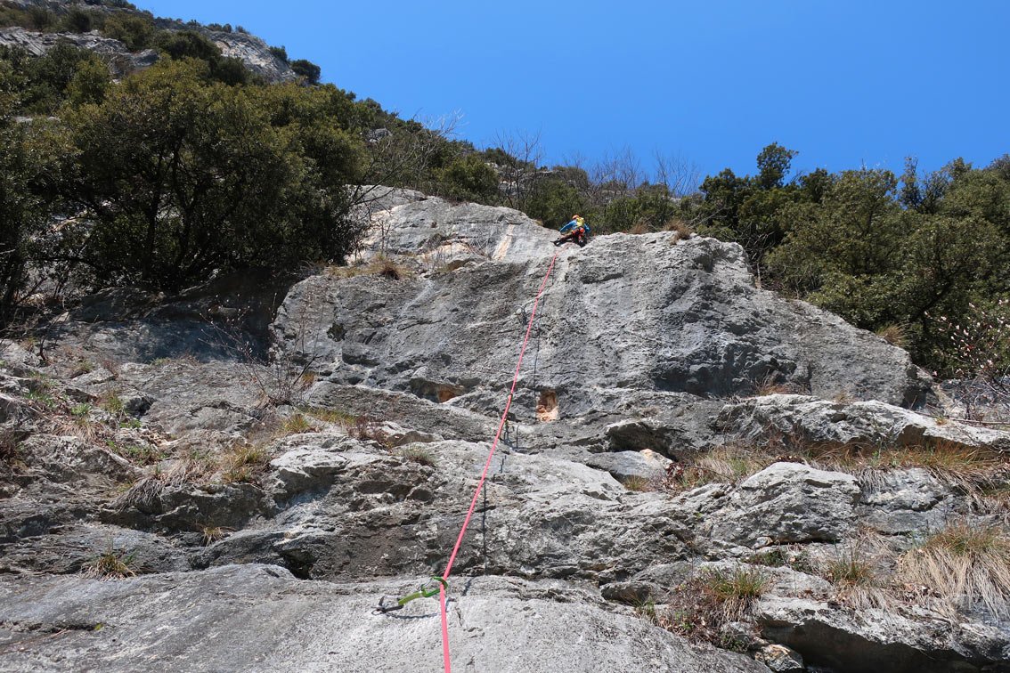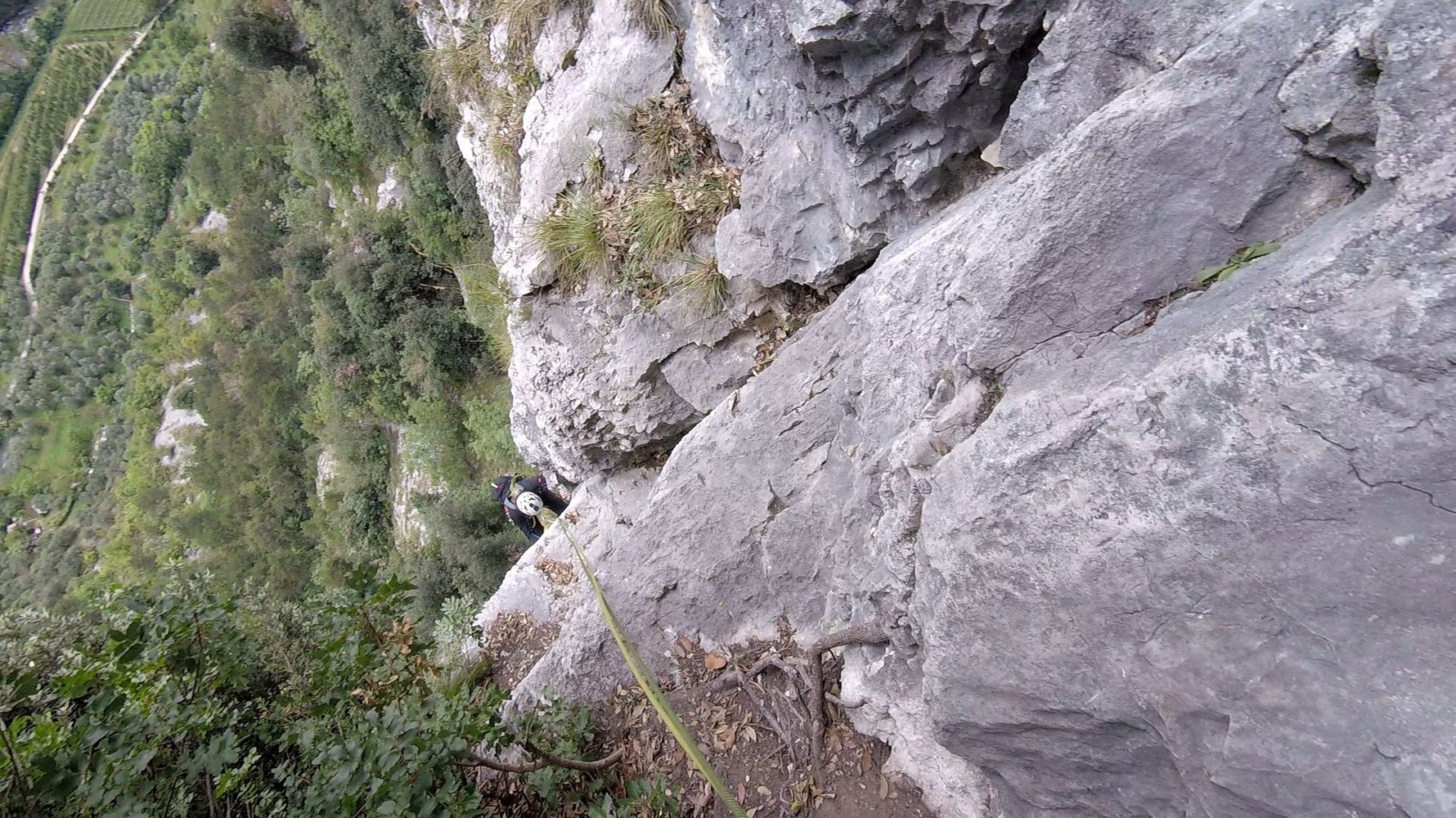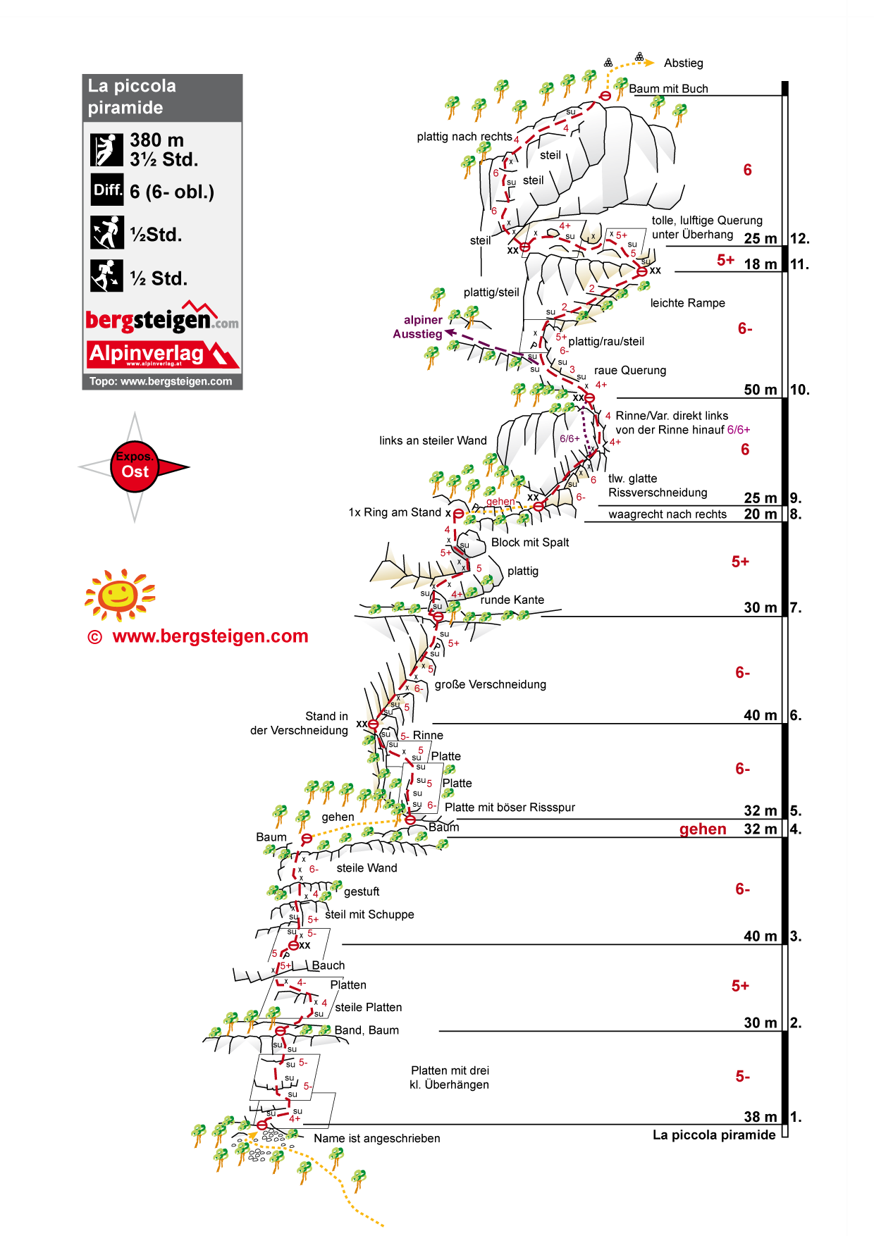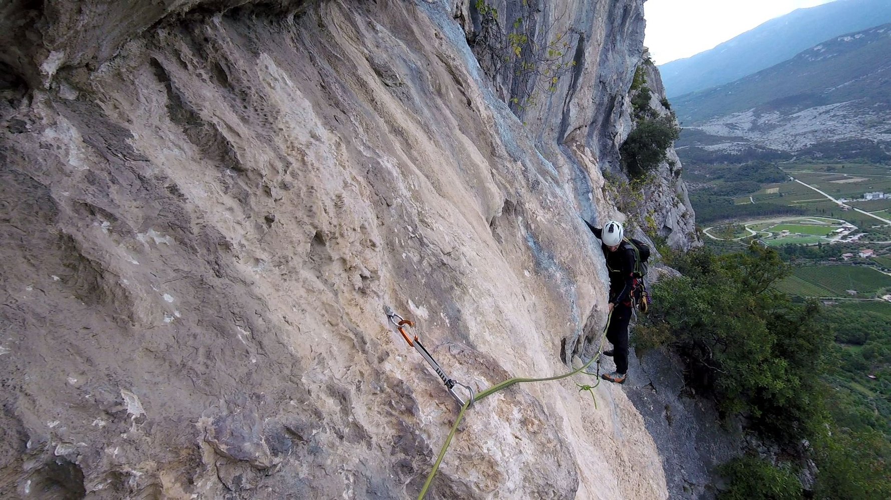 Gutmütige Alpintour ganz im Stil von Grill & Kluckner - einen Tick anspruchsvoller als die "Scalette dell' Indria". Die Route ist mit sehr vielen Sanduhren, einigen Normalhaken und Bohrhaken gesichert. Man könnte die Absicherung als "Gut" bezeichnen, aber kein Plaisir (im unteren 4ten Grad manchmal etwas weitere Abstände).