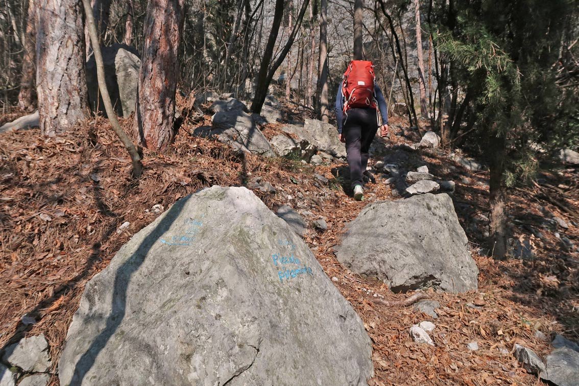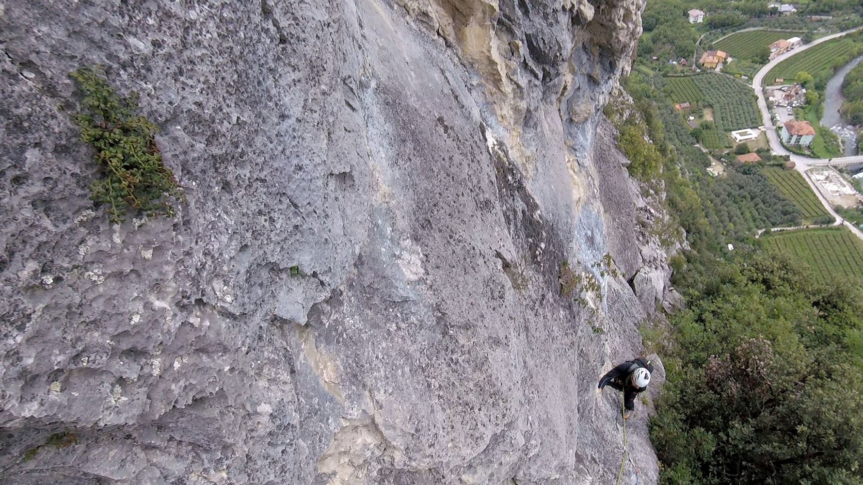 Vom Sportplatz Dro (Parkmöglichkeit) geht man 100 m in Richtung Felswände, dann links (südlich) auf dem Forstweg unterhalb der Felsen entlang. Man gelangt auf die Ortsstraße und folgt dieser bis zur Brücke. Dort auf der selben Bachseite gerade weiter, nach ca. 300 m erreicht man einen Steinmann mit der Aufschrift "Arrampicata". Dort rechts aufwärts und entlang des Pfades unter die Felswand und linkshaltend zum Einstieg (siehe Karte/GPS).