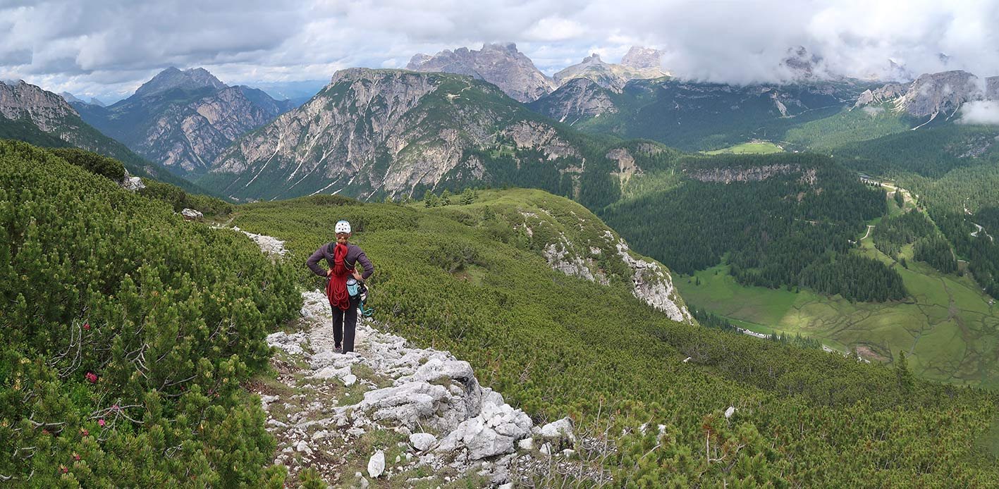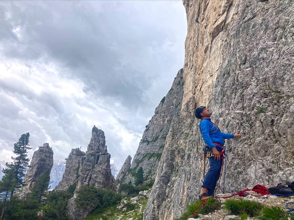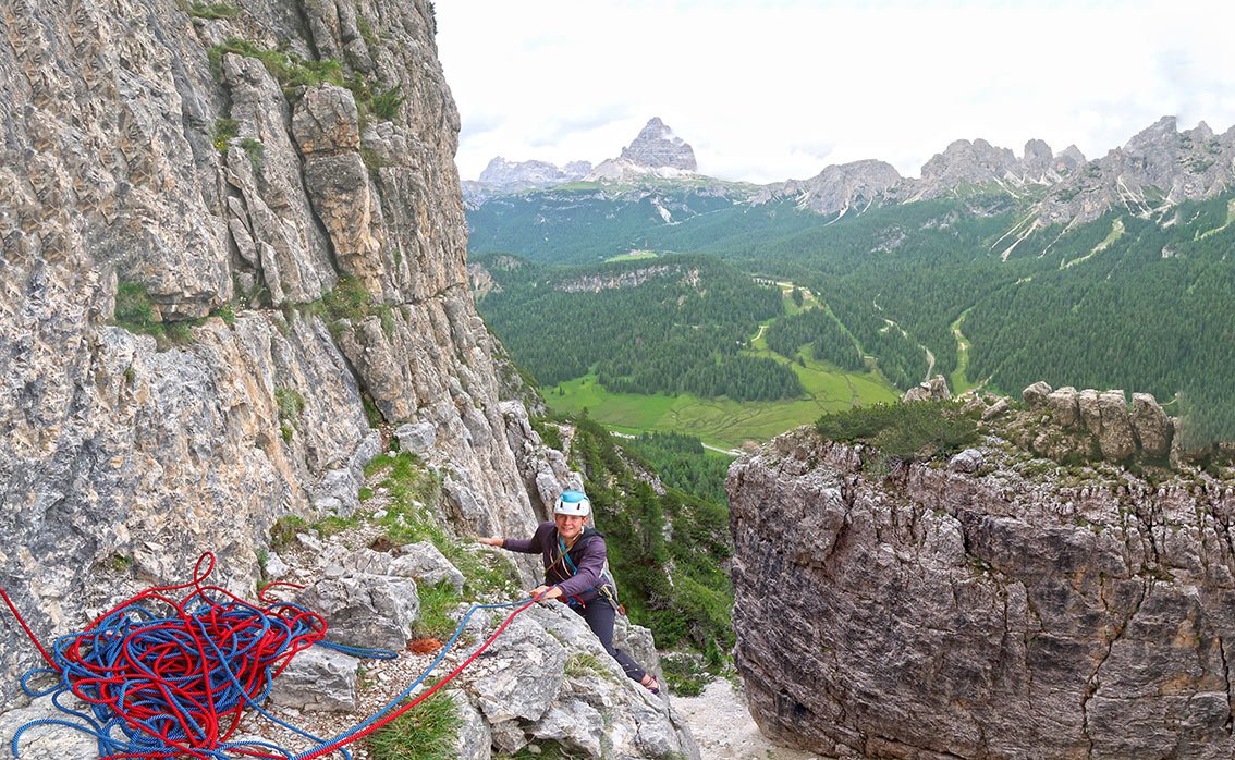 Die Route Prima volta di Martina ist ein Klassiker an den Südostwänden des Monte Popena Basso. Nach einer leichteren Einstiegsseillänge folgt schöne, griffige und am Ende leicht überhängende Kletterei - immer rechts der großen, gelben Riesenverschneidung. Am Ende noch ein kurzer, rustikaler Ausstiegs-Risskamin - das rundet das Dolomitenfeeling mit Drei-Zinnen-Blick perfekt ab.
