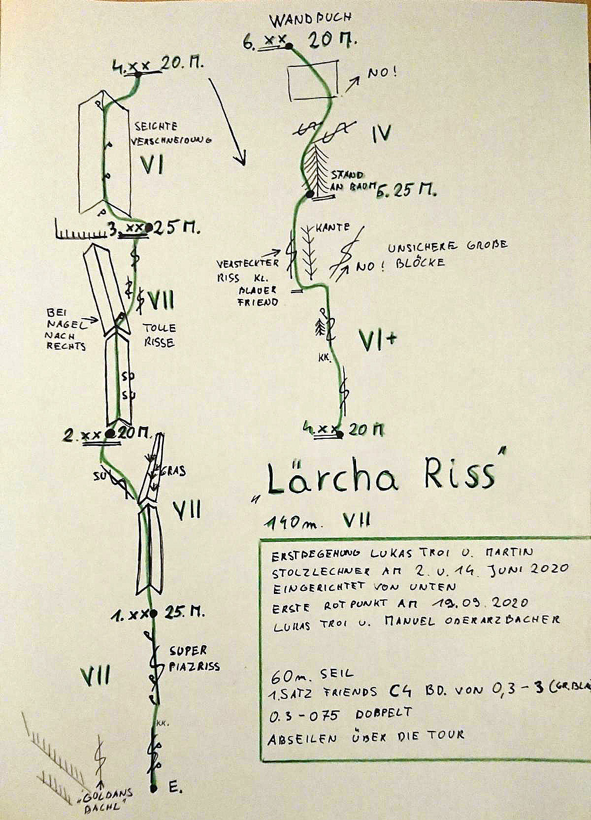 Die Erstbegangen am 2. und 14. Juni 2020 von Martin Stolzlechner und Lukas Troi von unten.