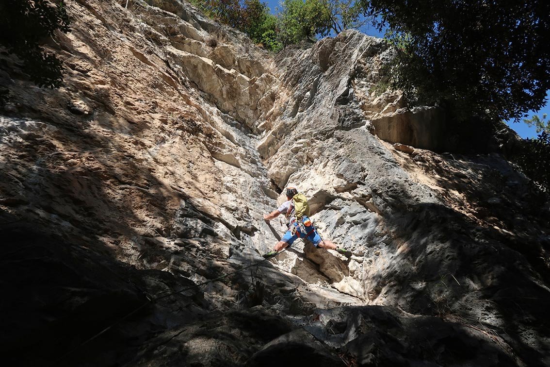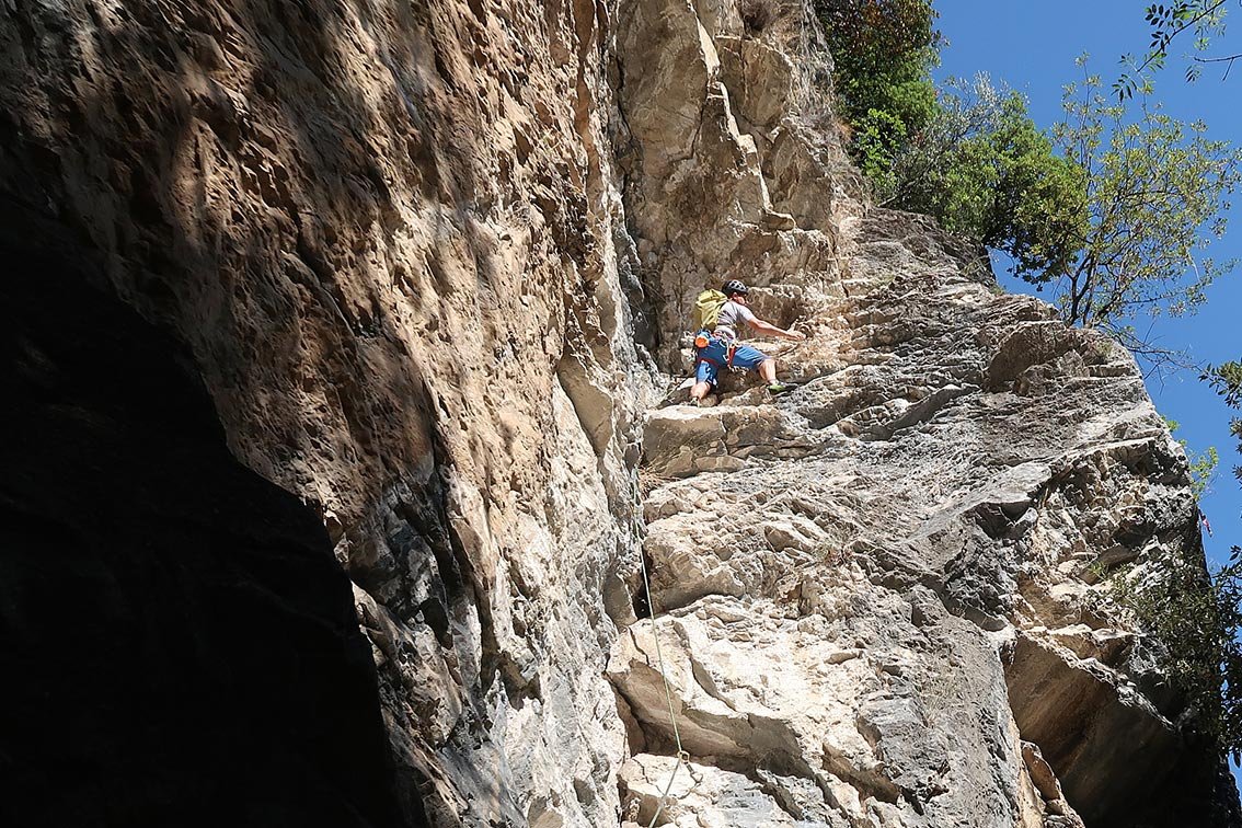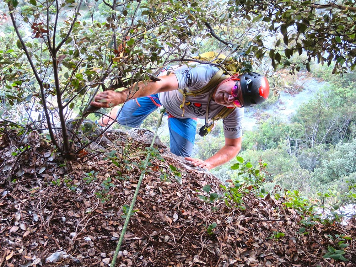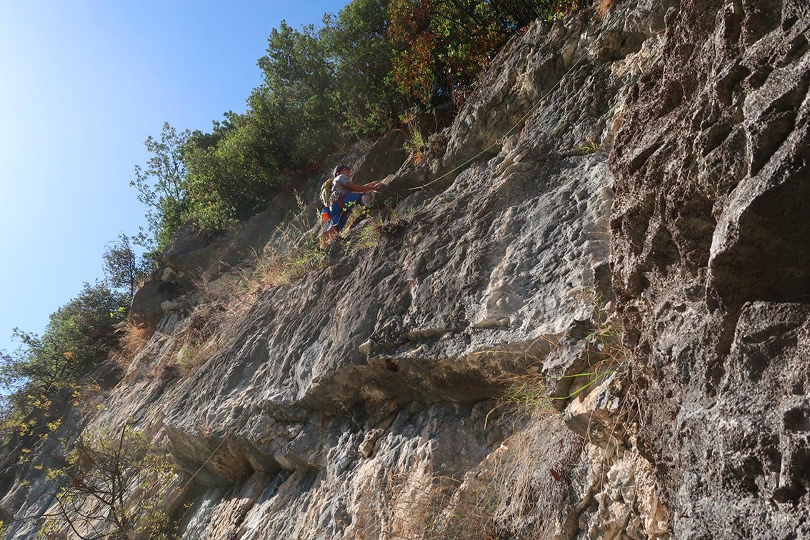 Vom Ausstieg kurz weiter aufsteigen (ungut erdig) bis man auf den markanten Wanderweg Nr. 428 „Sentiero degli Scaloni" trifft. Auf diesem orographisch links zum Wandfuß absteigen und über Zustieg zurück.