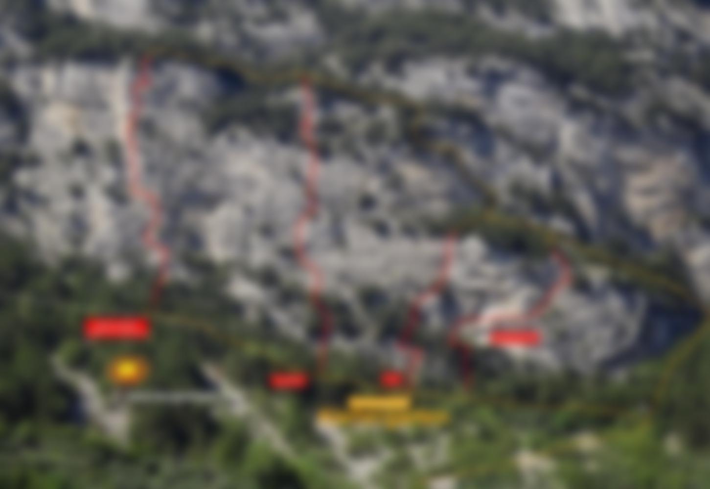 Vom Parkplatz auf der Straße Richtung Bauernhof „Maso Lizzone“ und davor links abzweigen (Wegweiser Wanderweg Nr. 428 „Sentiero degli Scaloni). Dem markierten Weg bis unter die Wand folgen und auf gutem Pfad am Wandfuss nach links zum Klettergarten abzweigen. Der Einstieg ist links von der Route "Gonzauer" unterhalb einer markanten, gelben Verschneidung.