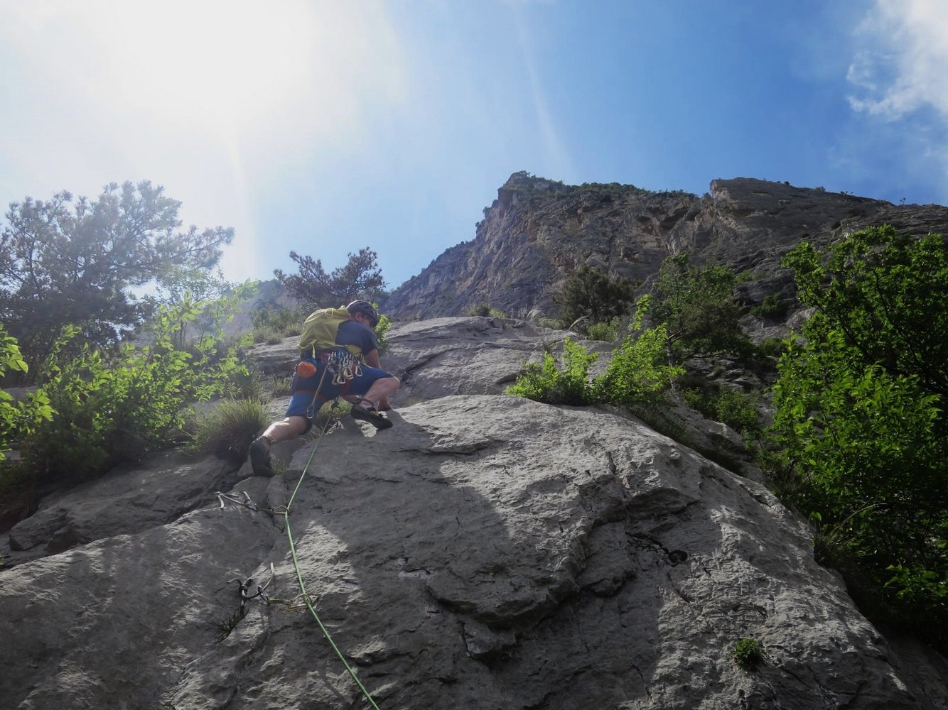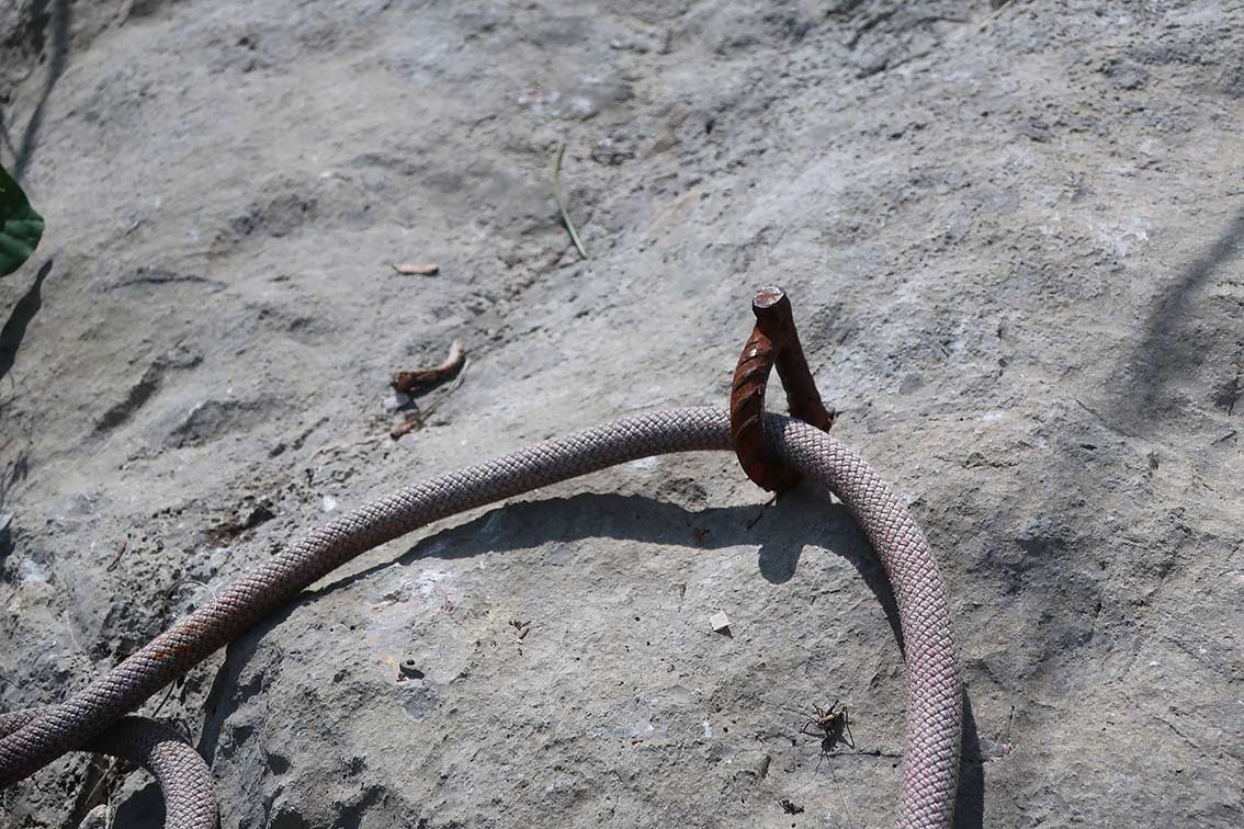 Die Route ist gut mit geklebten Normalhaken und Normalhaken abgesichert. Es sind grundsätzlich sehr viele Bohrhaken, SUs und Normalhaken vorhanden, aber alles - auch die Bohrhaken - in einer schlechten Qualität.