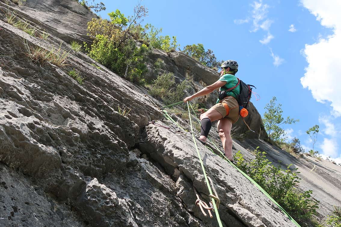50 m Einfachseil, Helm und 14 Expressschlingen.