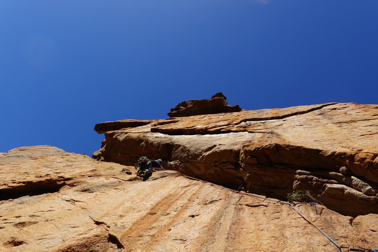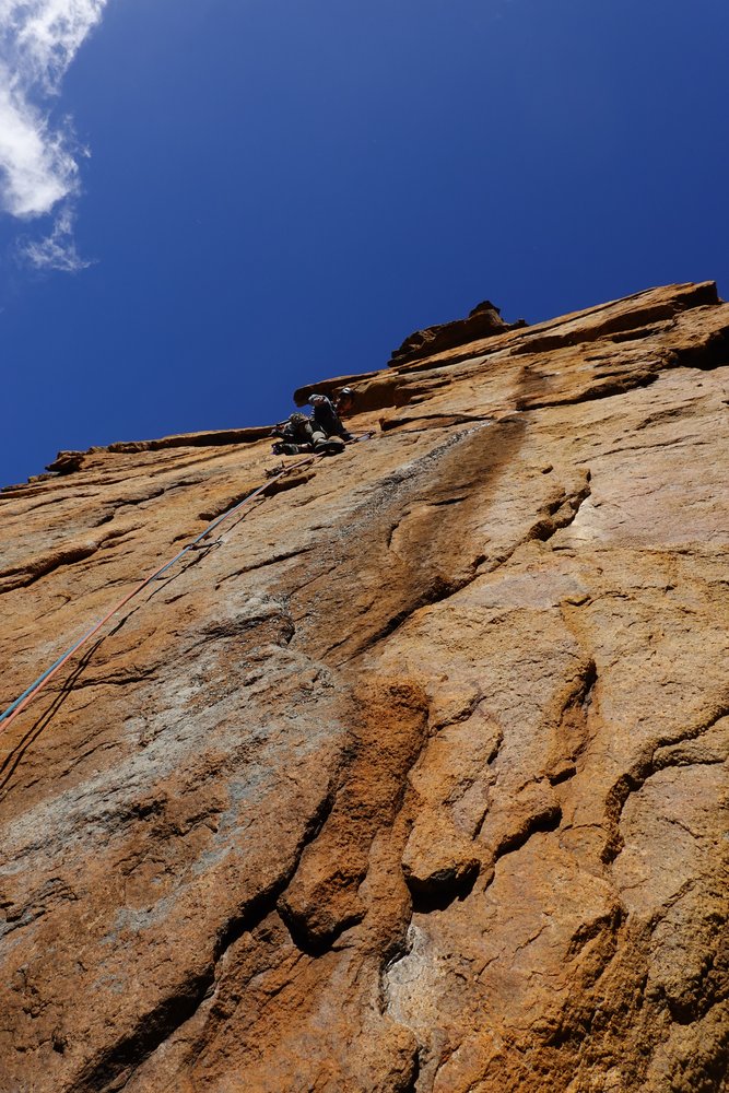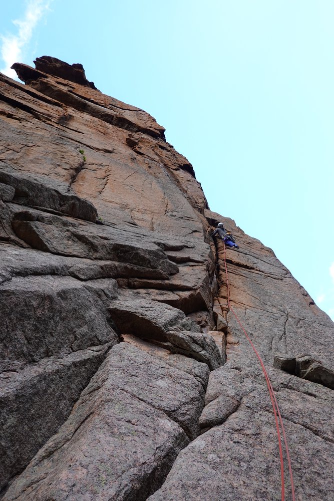 Follow the obvious dihedral for an enjoyable warm-up to the second belay. Bolt + sling