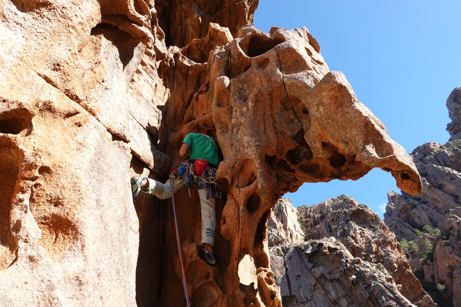 Die Route folgt Rissen, Tafonis und kurzen Wandstellen. Sie ist sehr gut absicherbar, an den wenigen nicht absicherbaren Stellen wurden insgesamt 3 Bolts gesetzt. Auch die Stände sind gebohrt.
