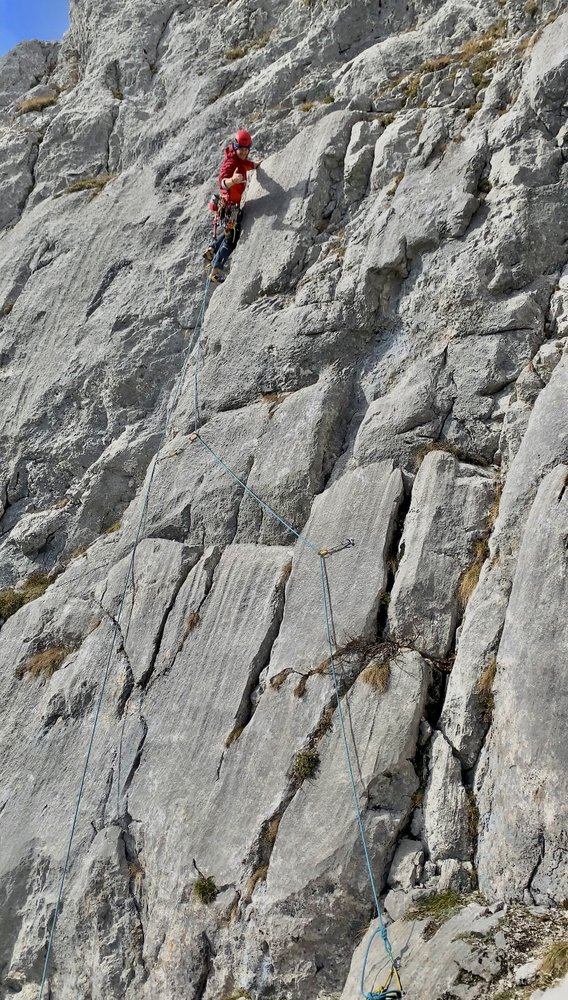 Route ist mit Bohrhaken abgesichert, es muss aber auch mobil abgesichert werden. (E 3-)