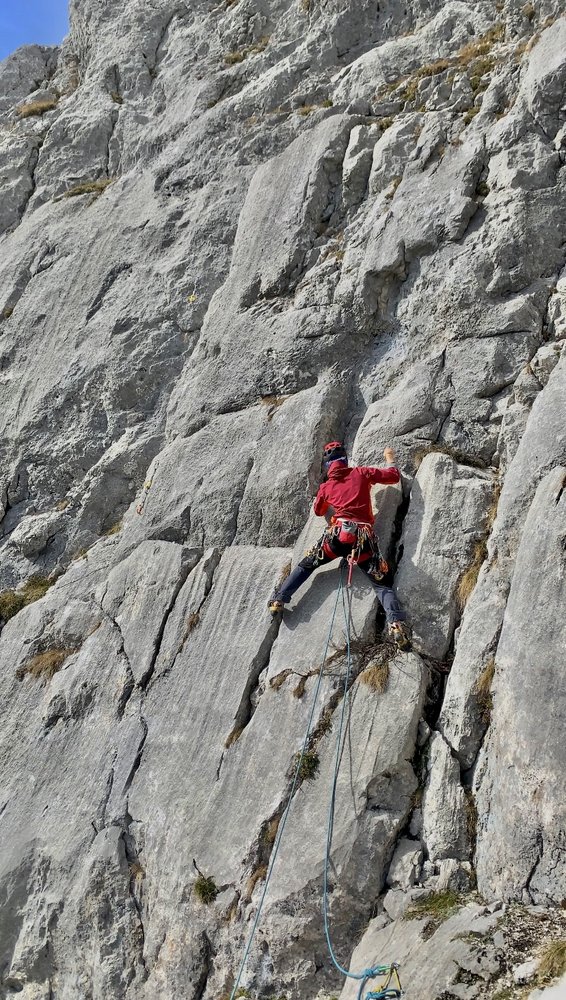 Alpin Sportkletter Route mit alpinem Charakter! Die Route "Lebens Reis" ist der alte Orginaleinstig (leichter als die "Lebens Weise"). Das Highlight ist der markante Pfeiler in der Mitte (sehr cool). Der Fels ist gut aber auch manchmal Splittrig und leicht Brüchig. Die Route ist noch sehr neu, deshalb kann der eine oder andere Griff oder Tritt locker sein! Man sollte den 6 Grad solide beherrschen, ansonsten hat man wenig Spaß daran.