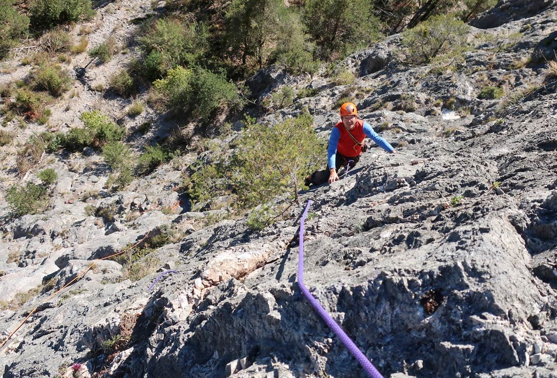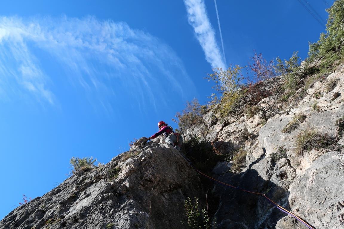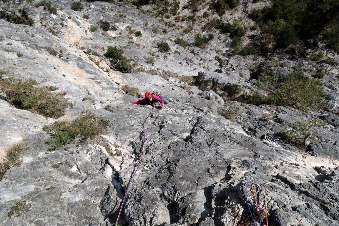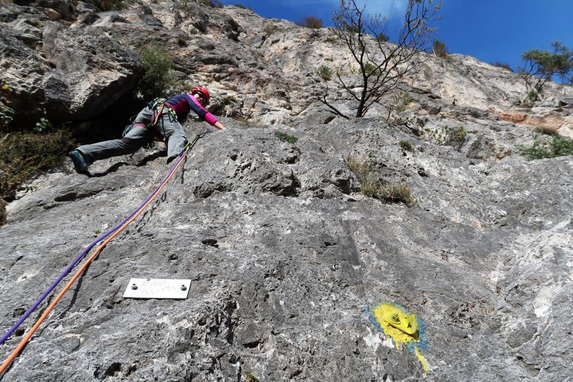 Gut mit Bohrhaken abgesichert, einizig in der ersten Seillänge und im leichten Gelände etwas größere Abstände.