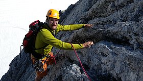 Leichte Tour an der Nordwand des Kleinen Koppenkarstein. Die Tour ist aber nicht, wie im Führer beschrieben, eine Anfängertour. Die ersten Seillängen zeichnen sich durch steile, tolle Plattenkletterei aus, selten klettert man einen so kompakten 4er.