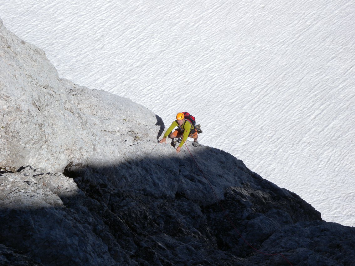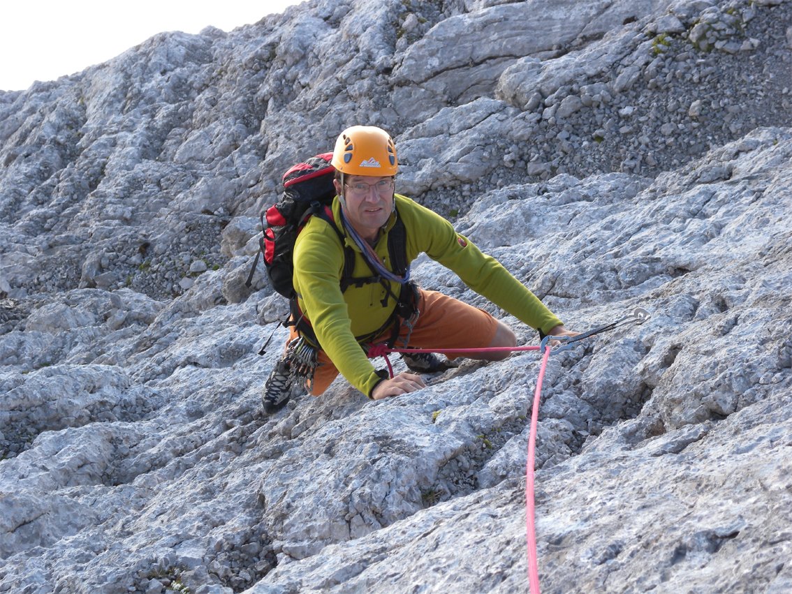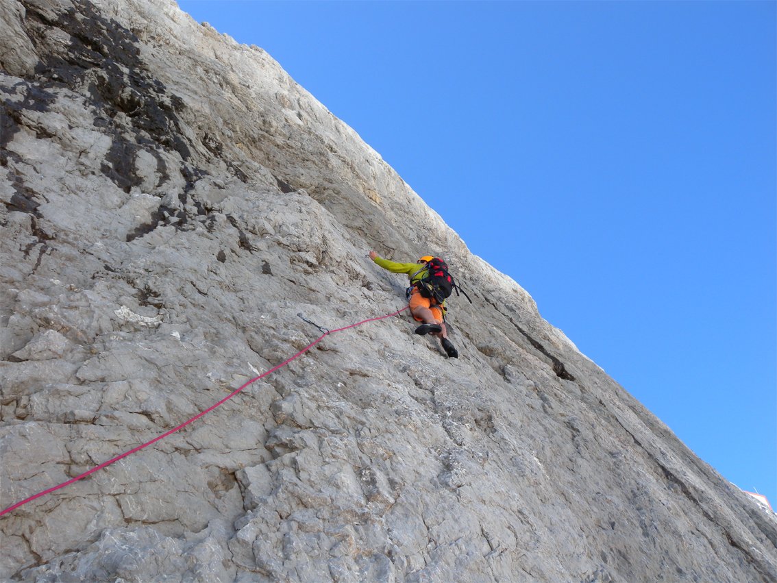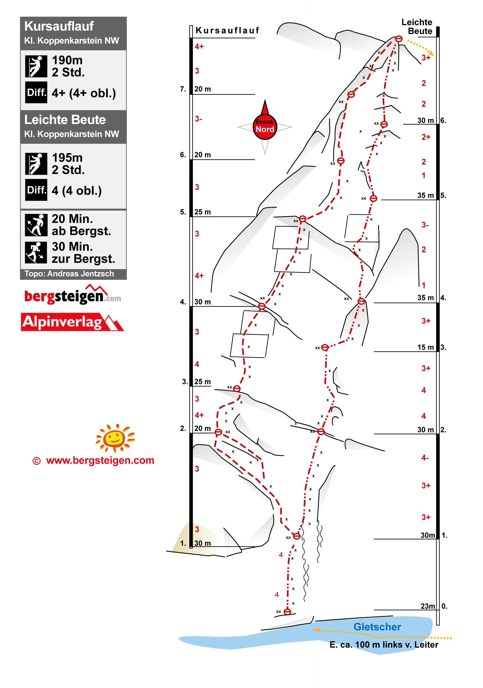 Leichte Tour an der Nordwand des Kleinen Koppenkarstein. Die Tour ist aber nicht, wie im Führer beschrieben, eine Anfängertour. Die ersten Seillängen zeichnen sich durch steile, tolle Plattenkletterei aus, selten klettert man einen so kompakten 4er.