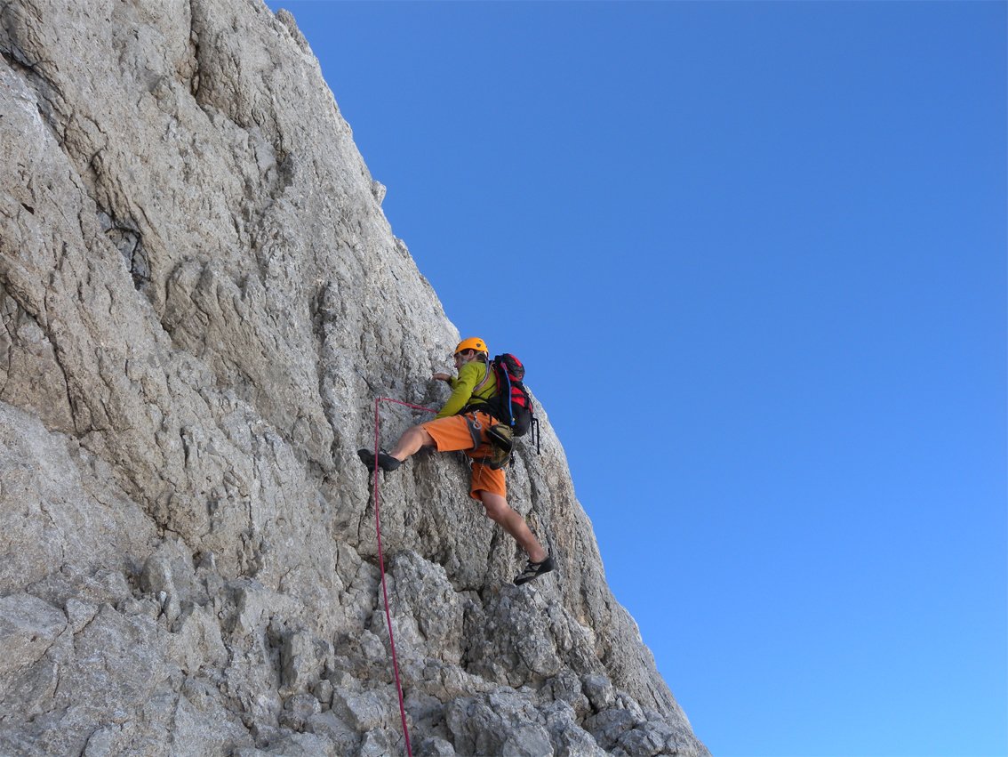 Wenn nach einem weitere Seillschaften in die Wand einsteigen, ist im oberen Wandteil Steinschlag vermeiden. Die Tour verlangen solides Klettern im 4ten Grat.