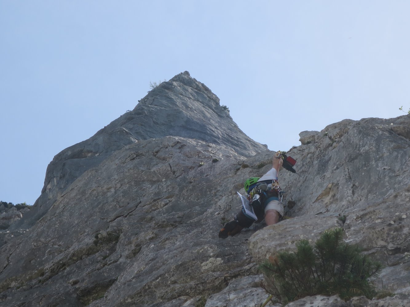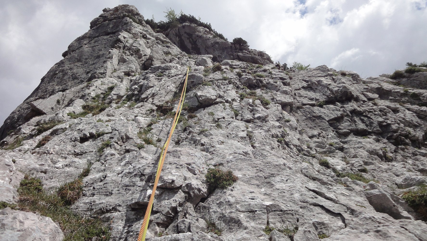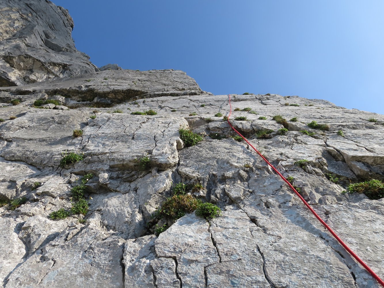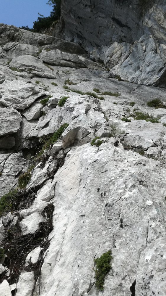 SL6: Leichte Seillänge durch Schrofen, alpines Gespür für die Wegfindung erforderlich. Bis zur 4.Zwischensicherung links halten, dann leicht rechts rauf zum Stand (versteckte Zwischensicherung)