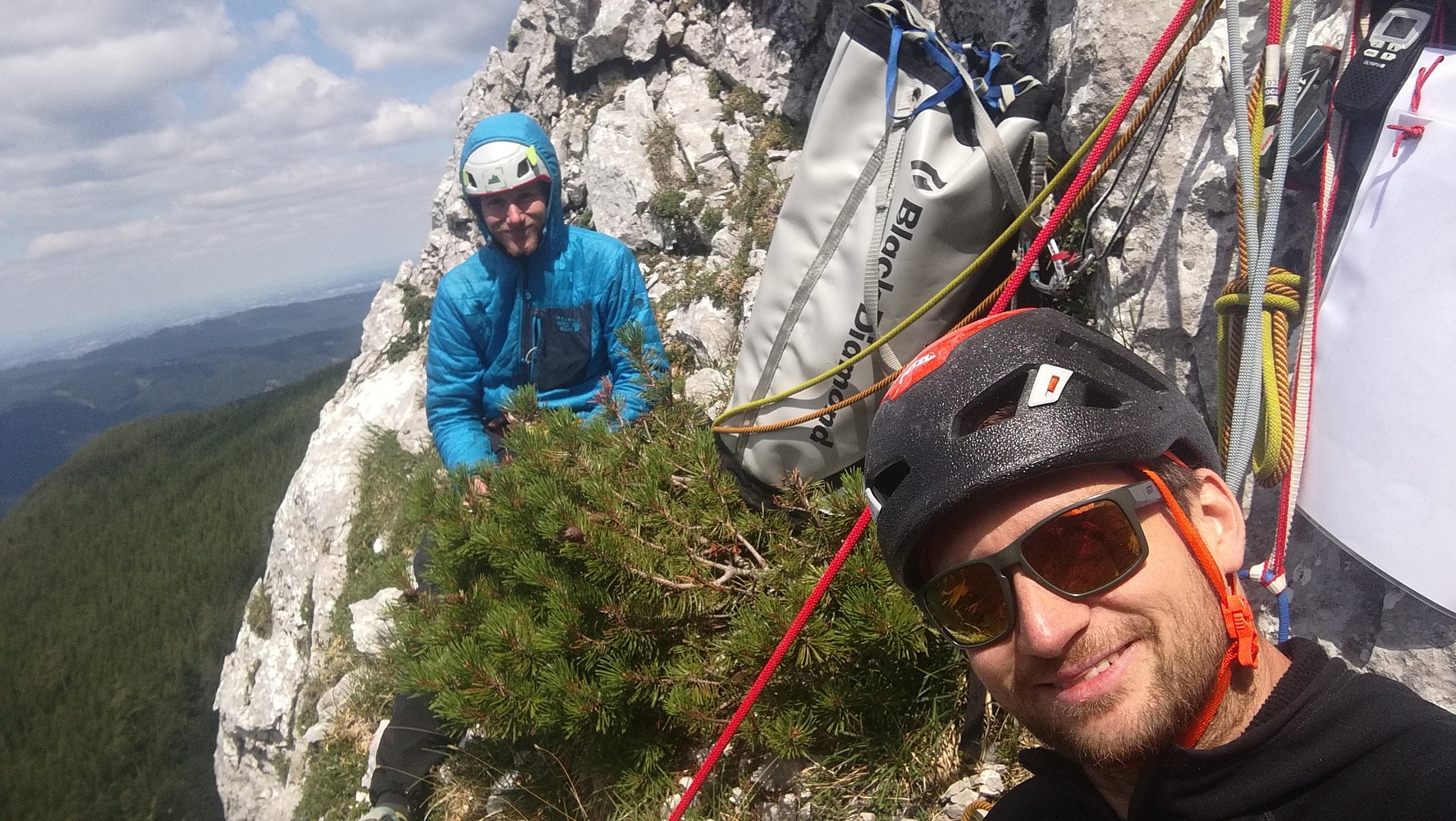 SL5: Wunderschöne Wandkletterei, leicht rechtshaltend und um die Ecke (versteckte Zwischensicherung: lange Schlinge!). Steiler Aufschwung, der nochmal einiges abverlangt, dann etwas brüchig bis zum Luxus-Stand.