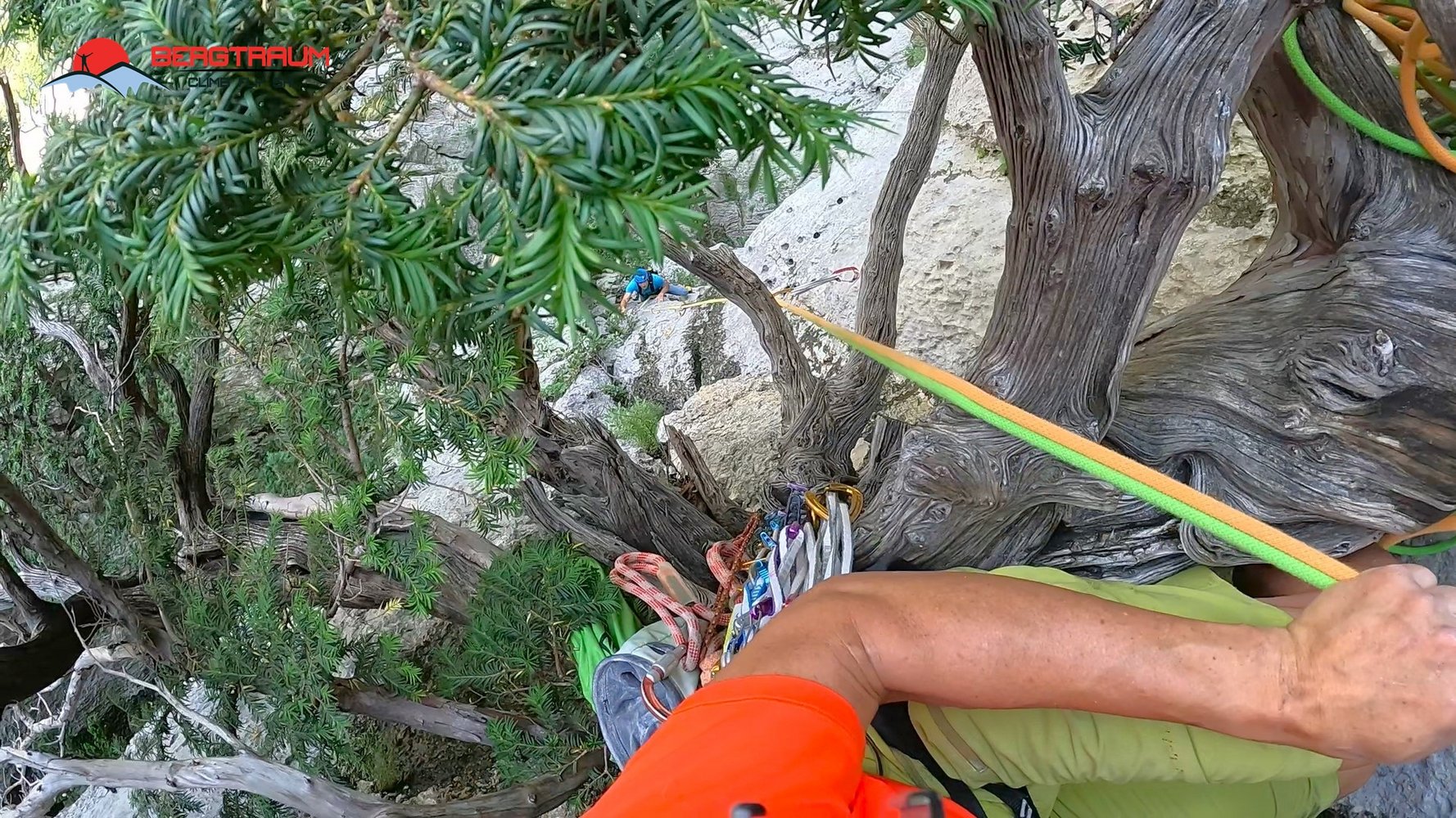 L1- 5c, 30 m: in der Verschneidung rauf über super Fels und linkshaltend zu Stand bei markantem Baum