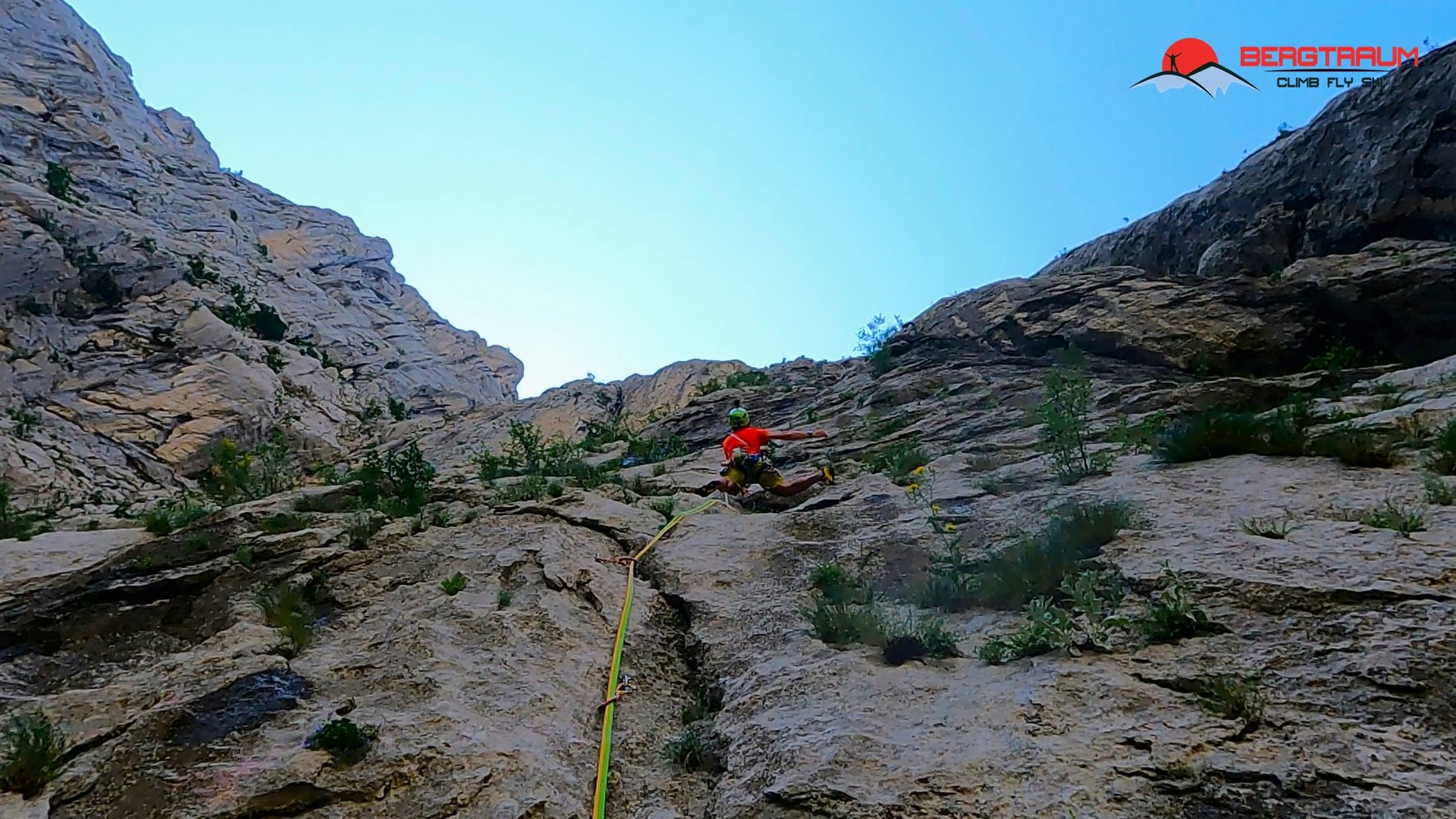L4- 4b, 40 m: In einer seichten Verschneidung links rauf zu Stand beim markanten Quergang der brid ca veliki cekic.
