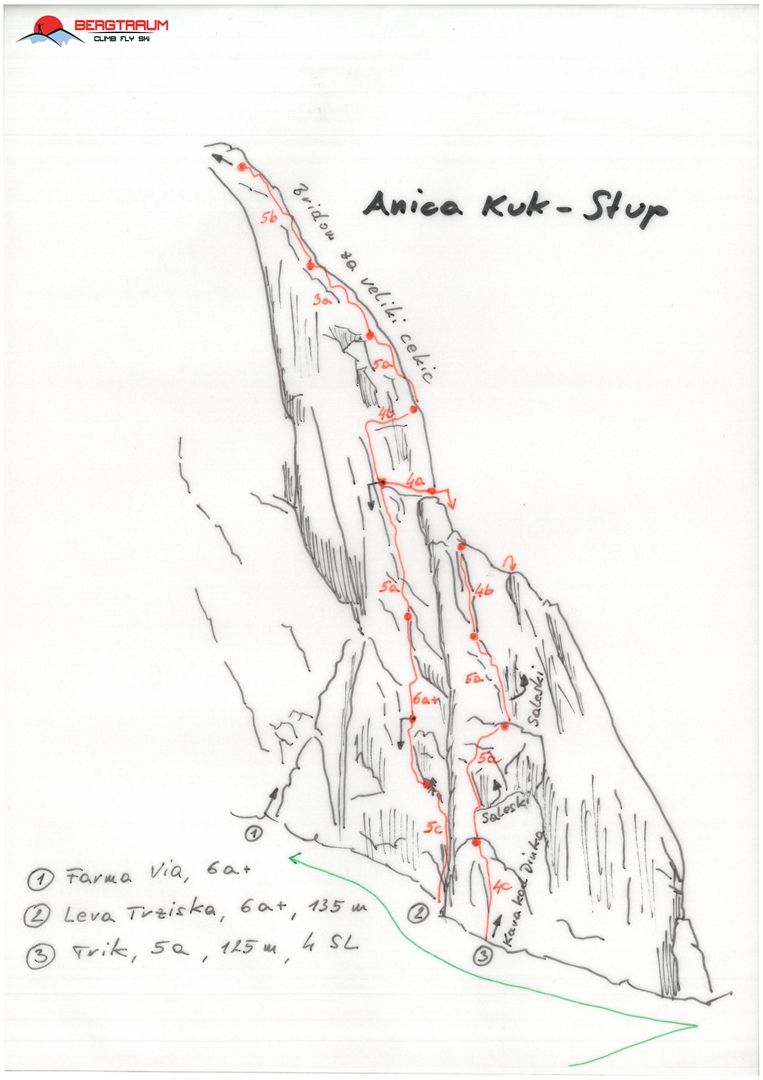 Eine ausgesprochen schöne Linie an der NW- Seite des Stup. Einstieg unmittelbar links neben der Saleski und der Trik. In Kombination mit den benachbarten Linien oder der brid ca veliki cekic hinauf auf den Kuk ist das perfekt für den ersten oder letzten Klettertag.