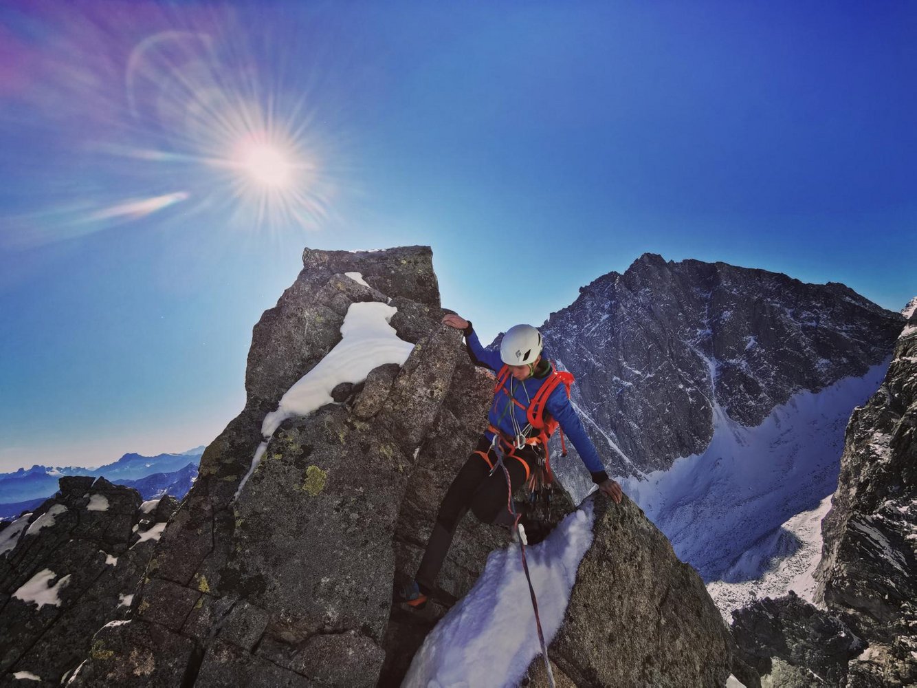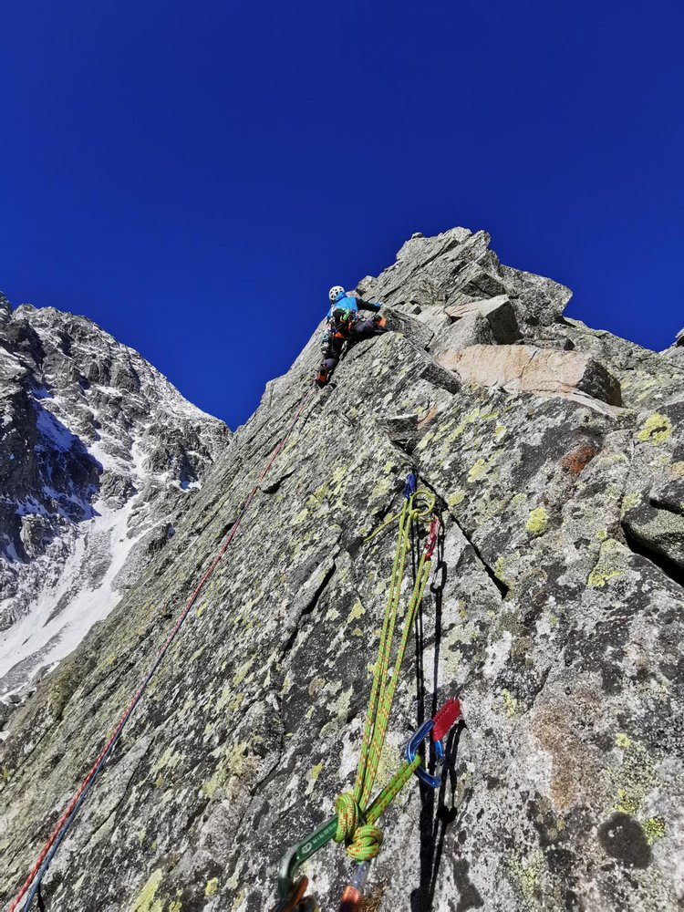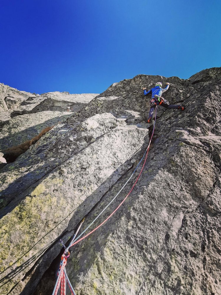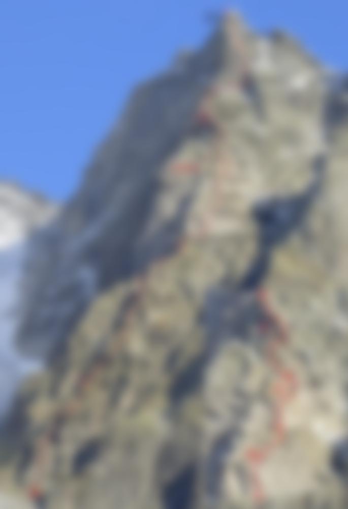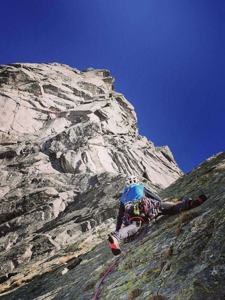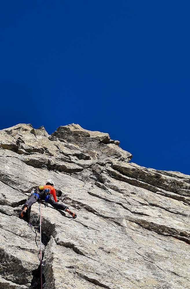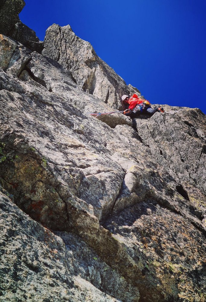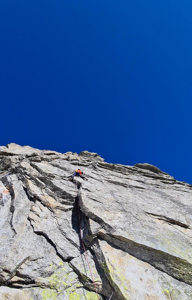 Begeisternde und lohnende alpine Kletterei entlang von Rissen, Platten und Gratkanten auf größtenteils sehr festen Gestein.