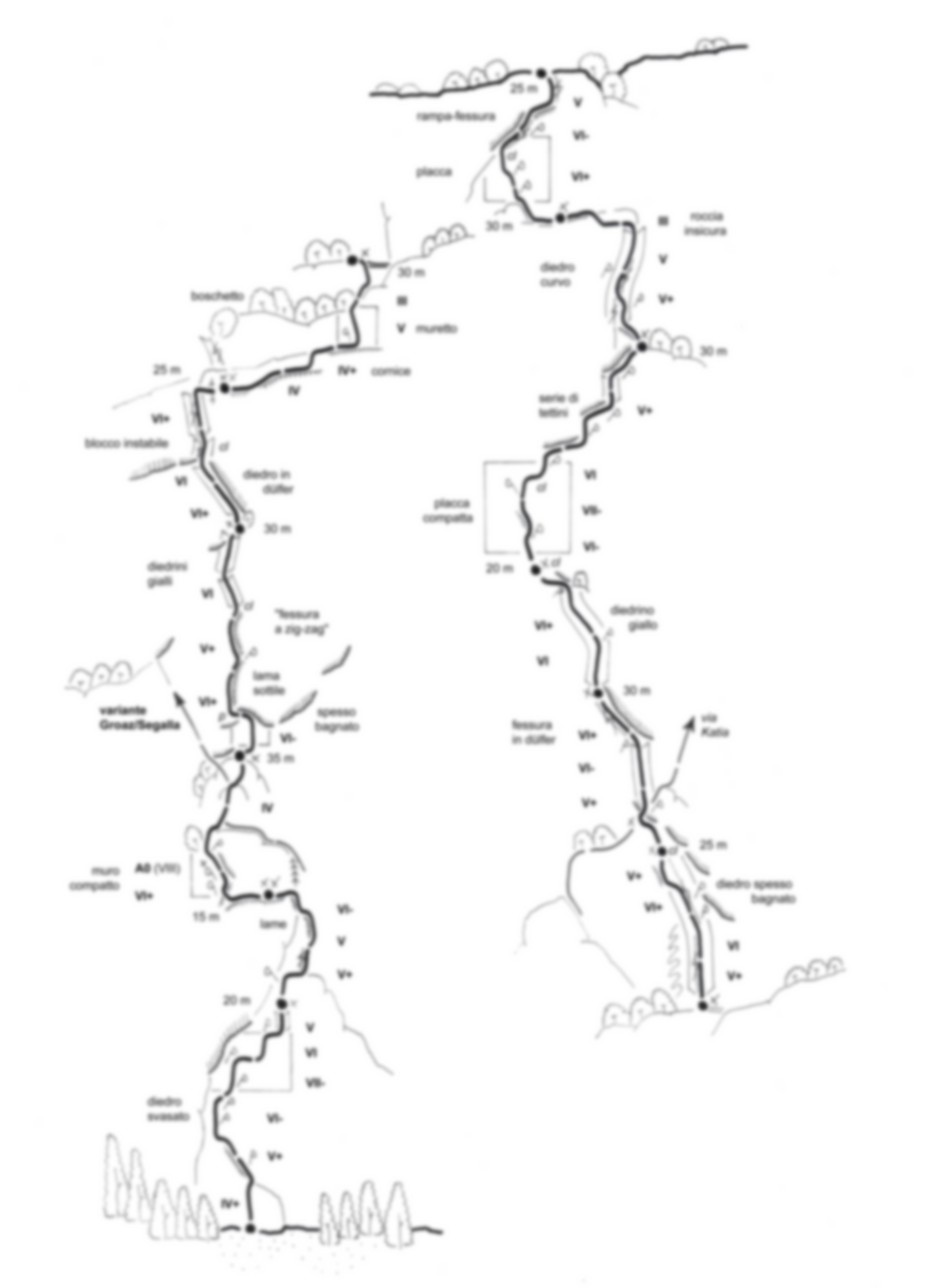 Anspruchsvolle und naturgegebene Linie, gerade durch den rechten Teil der breiten Ostwand, wobei in der oberen Hälfte die diagonal verlaufende »via Katia« gekreuzt wird. Es handelt sich um einprägsame, luftige Kletterstellen in buntem Wechsel von Platten und herrlichen Verschneidungen, an fast durchgehend gutem sowie sehr rauem Sarcakalk. Die knackigen Verschneidungsseillängen müssen weitgehend selber abgesichert werden, während in den drei Schlüsselstellen die nötigen Haken vorhanden sind. Bei starker Nässe im Mittelteil, wird das gewöhnliche einzigartige Felserleben beeinträchtigt. In der Gesamtanforderung wesentlich strenger als die klassischen Colodri Routen.