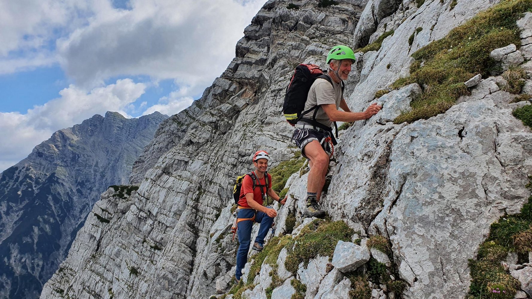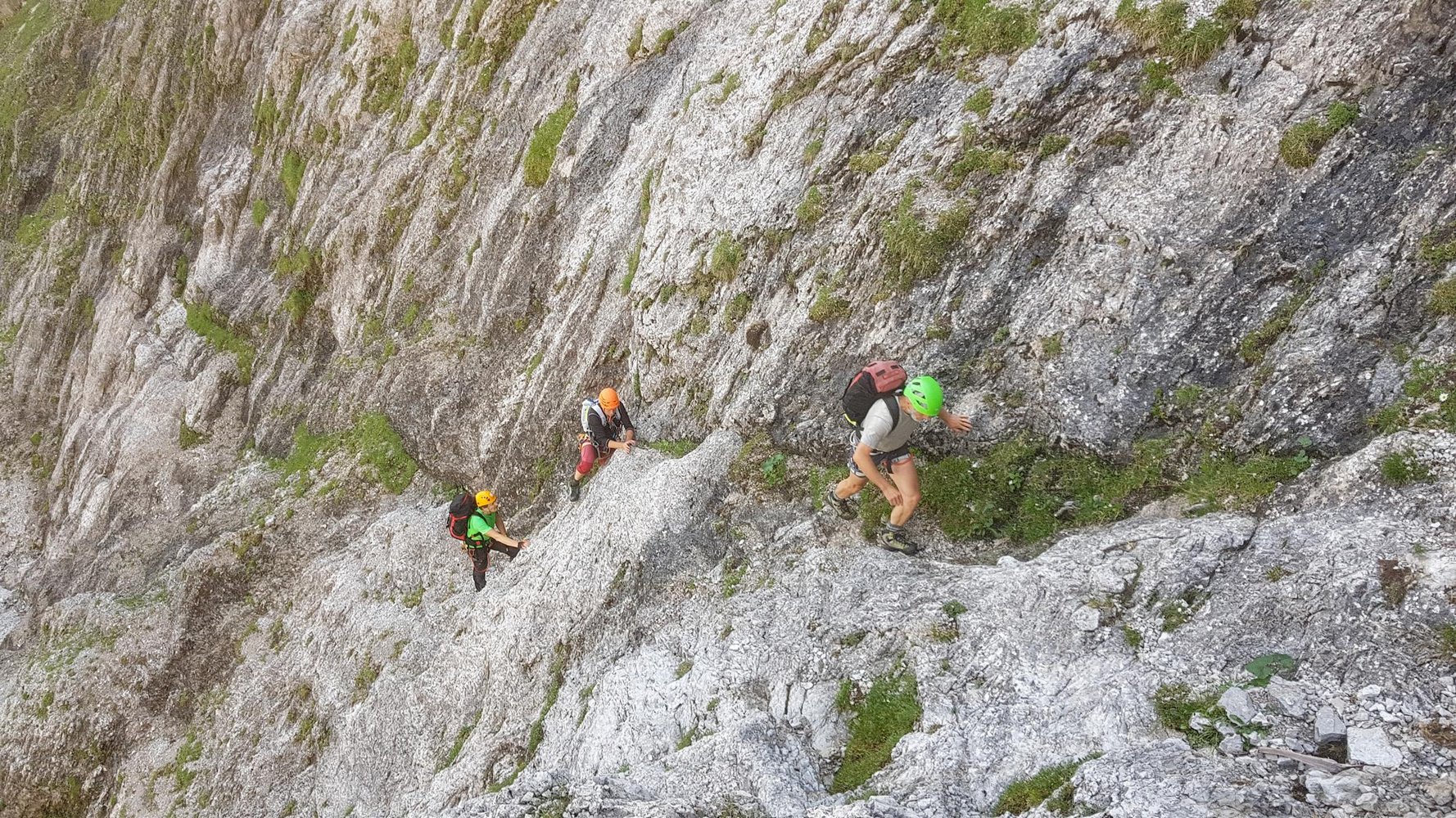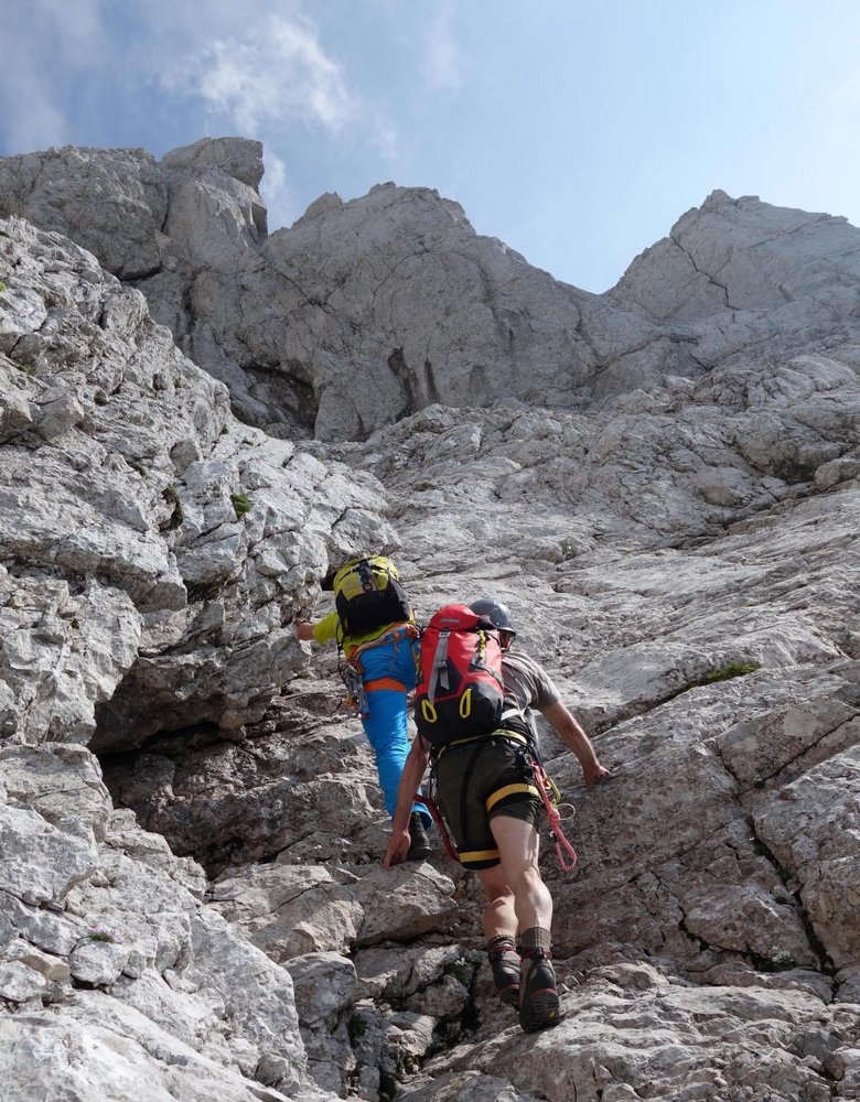 Felsqualität: Im Vorbau wechseln sich schrofig-schottrige mit grasigen Passagen ab. Ab dem Linzer-Pfeiler gibt es dann recht guten Fels. In der Schlusswand wechselt sich nicht immer ganz fester, großgriffiger, mit kompaktem plattigem Fels ab.