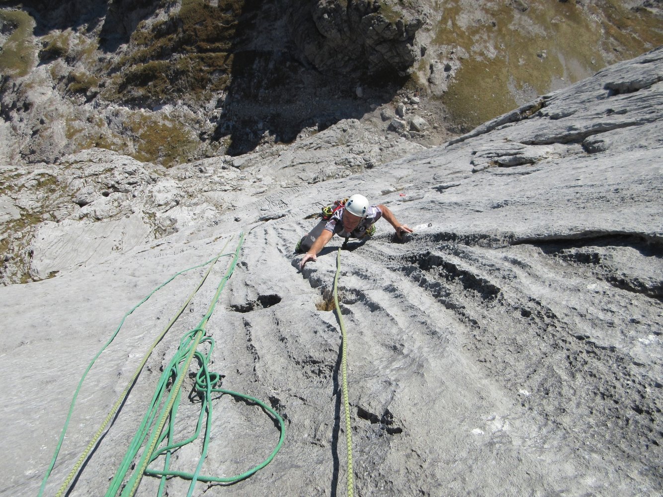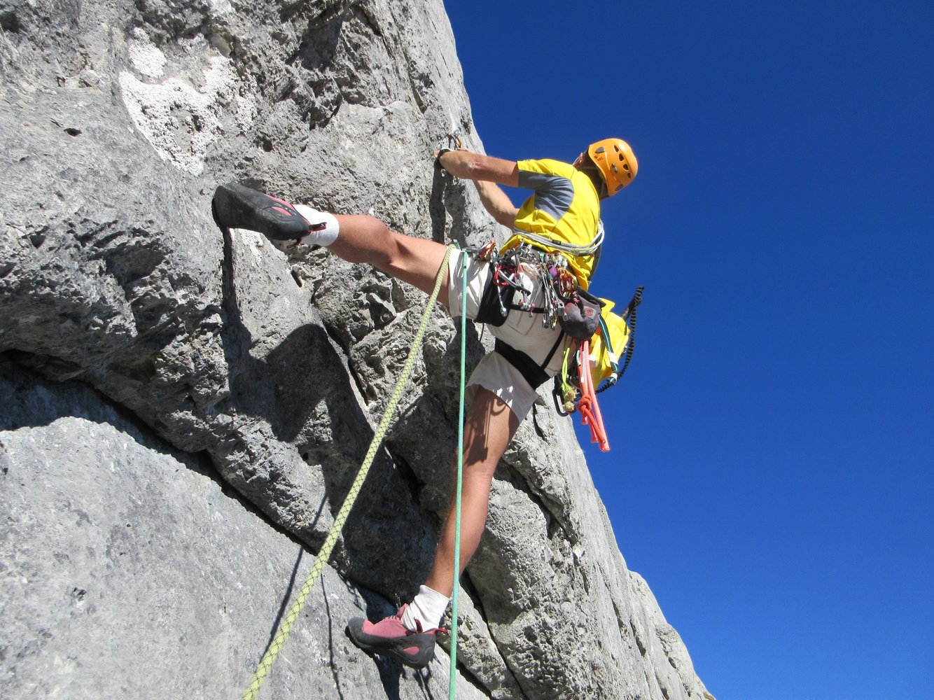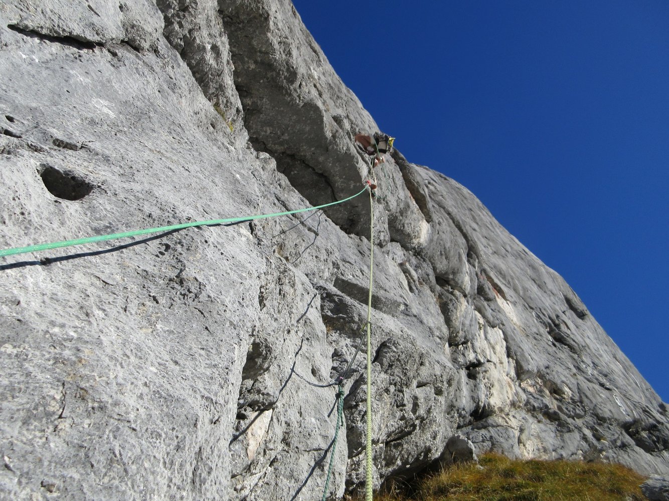 Alpine Sportkletterroute, wobei an wenigen Stellen zusätzlich mobile Geräte gelegt werden können/müssen..