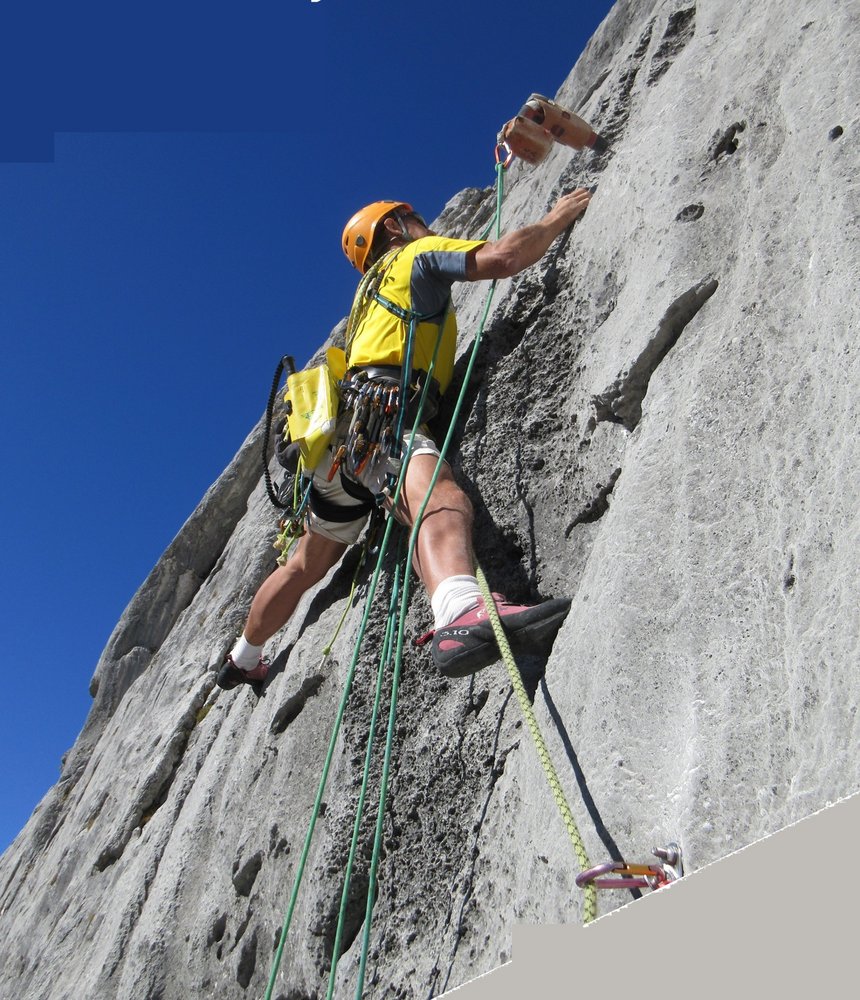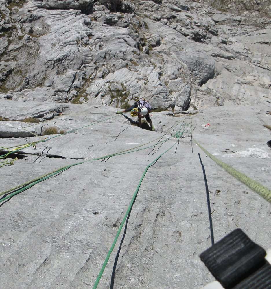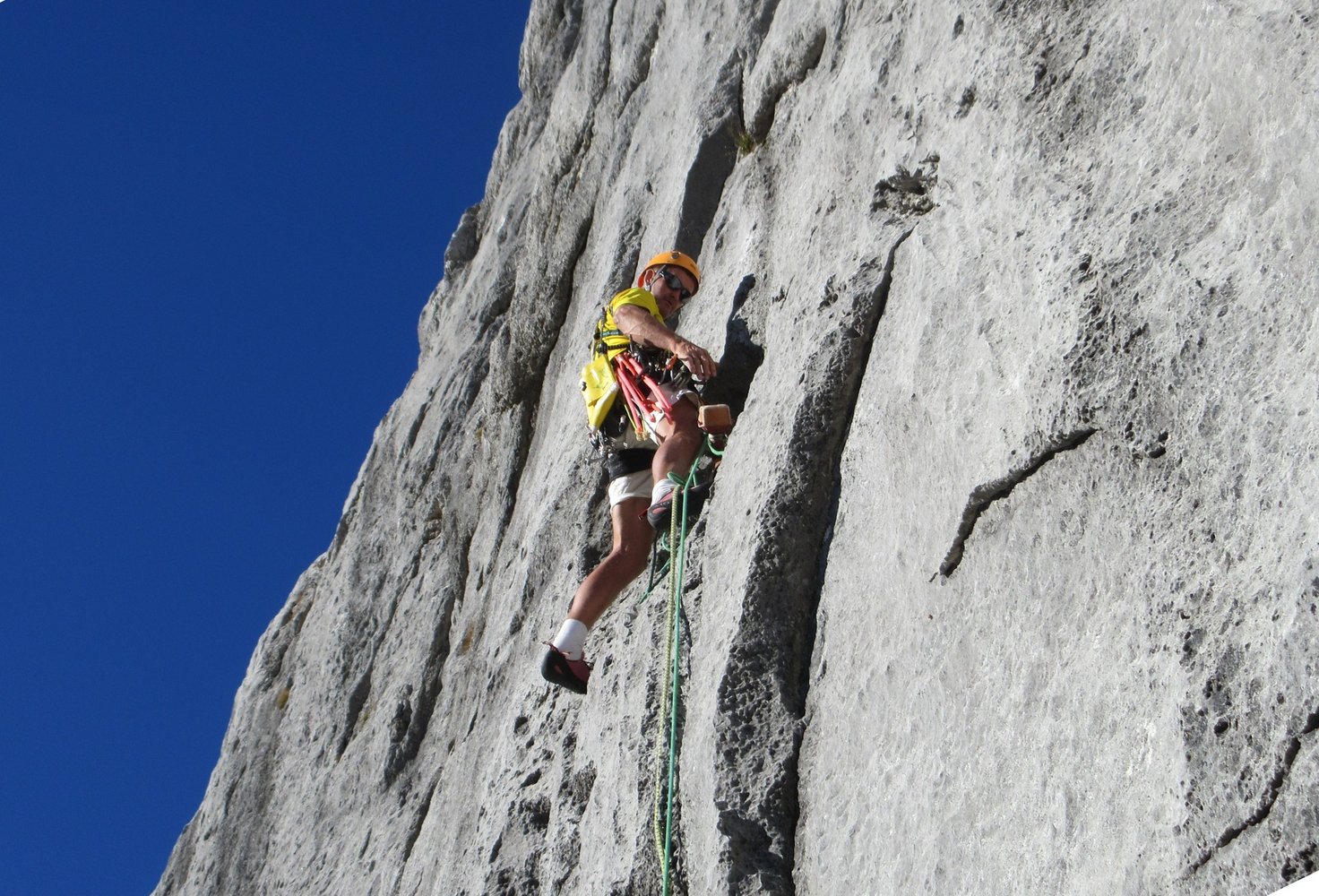 Alpine Sportkletterroute, wobei an wenigen Stellen zusätzlich mobile Geräte gelegt werden können/müssen..