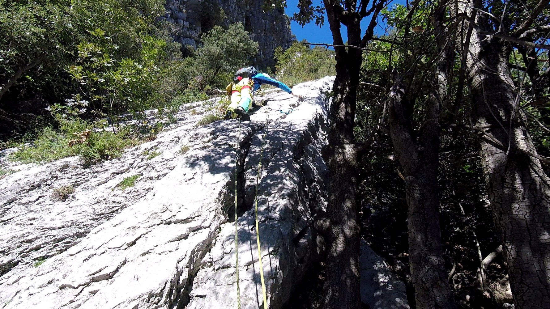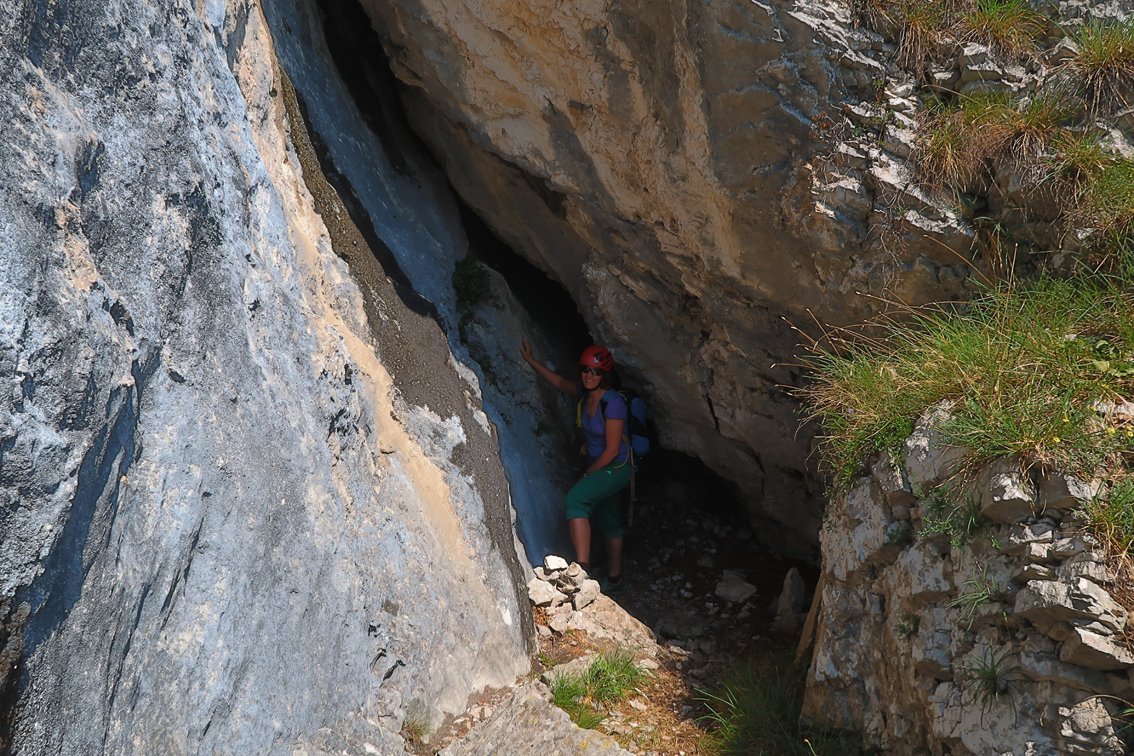 Vom Ausstieg auf dem Pfad aufwärts, es kommt ein Pfad von links dazu, man steigt bis zu einem Felsspalt auf. Durch den Spalt, dann etwas abwärts, danach flach bzw. leicht ansteigend lange queren. Man kommt zu einem Abbruch, dieser ist mit einem Stahlseil und Eisenleitern gesichert (Mini-Klettersteig). Danach folgt man dem Pfad hinunter nach Massenza und geht durch den Ort zurück zum Parkplatz beim E-Werk.
